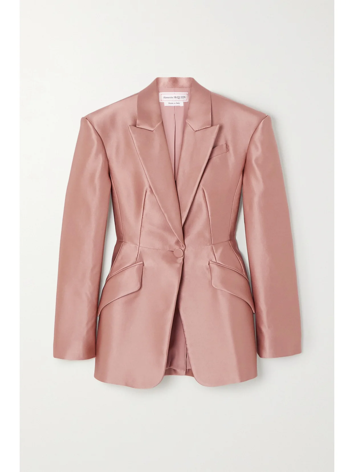 Alexander McQueen's Fall '20 collection is inspired by the poetic and artistic heritage of Welsh folklore. Worn by Amber Valletta on the runway, this blazer is cut from blush duchesse silk-satin and has a glistening metallic finish. Mimic the show styling by wearing yours with the [matching pants id1282660]. Wear it with: [Alexander McQueen Shoulder bag id1284863], [Alexander McQueen Earrings id1284058].