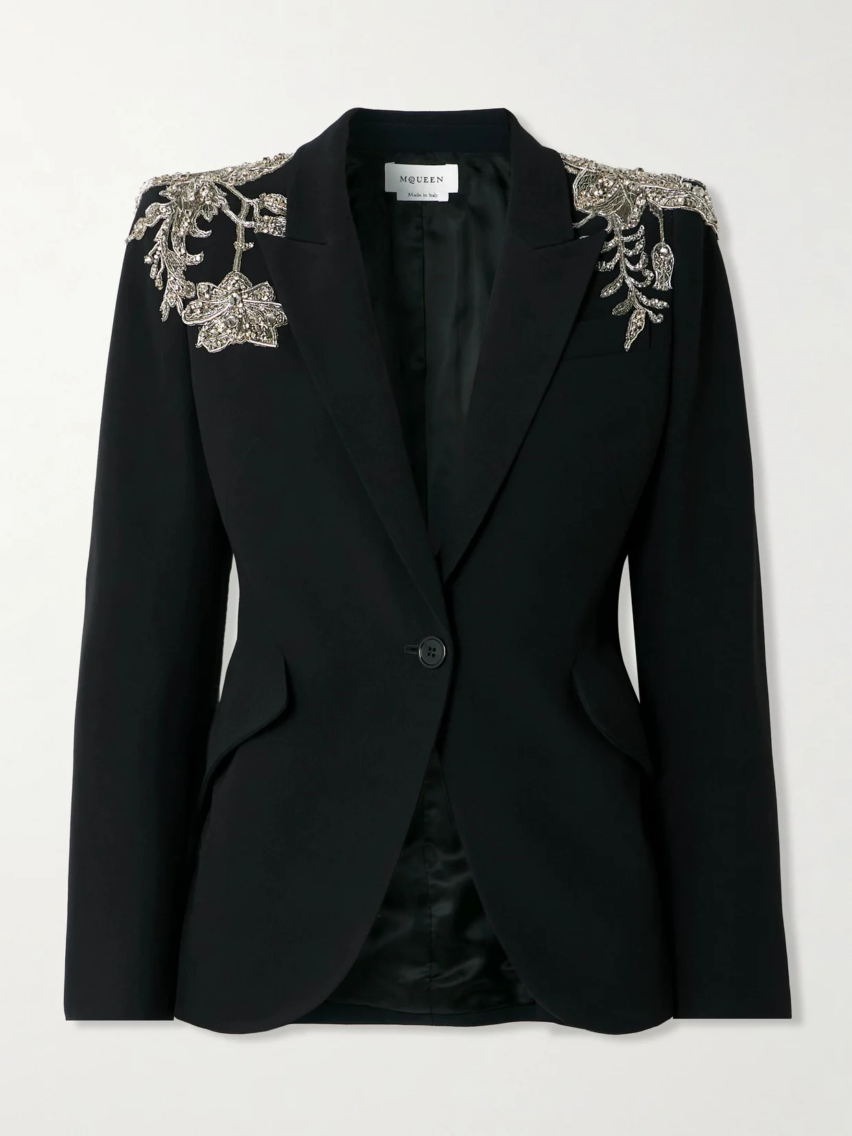 McQueen's blazer is adorned with crystals trailing down the shoulders - an artful touch that'll photograph beautifully. Showcasing what the label does best, it's tailored from crepe with structured shoulders and angled flap pockets, which accentuate the tapered waist.