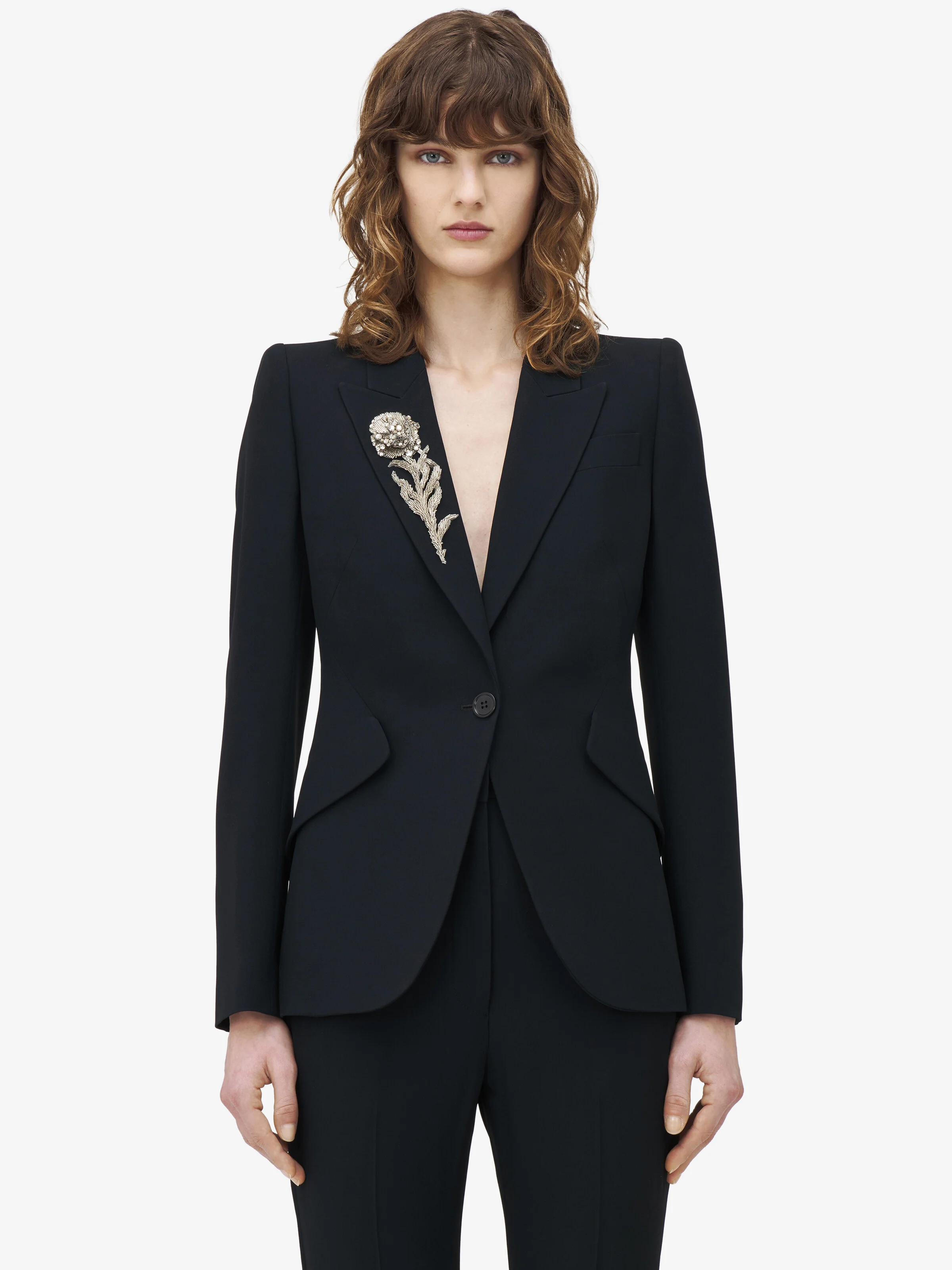 Peak shoulder single-breasted jacket in black leaf crepe. The jacket features peak lapels with a floral crystal embroidery, side flap pockets and a single button fastening. Product details - Peak lapels - Slit pocket on the chest - Single button fastening - Product code: 830147QEAAA1000 - Made in Italy - Material: 52% Viscose, 48% Acetate
