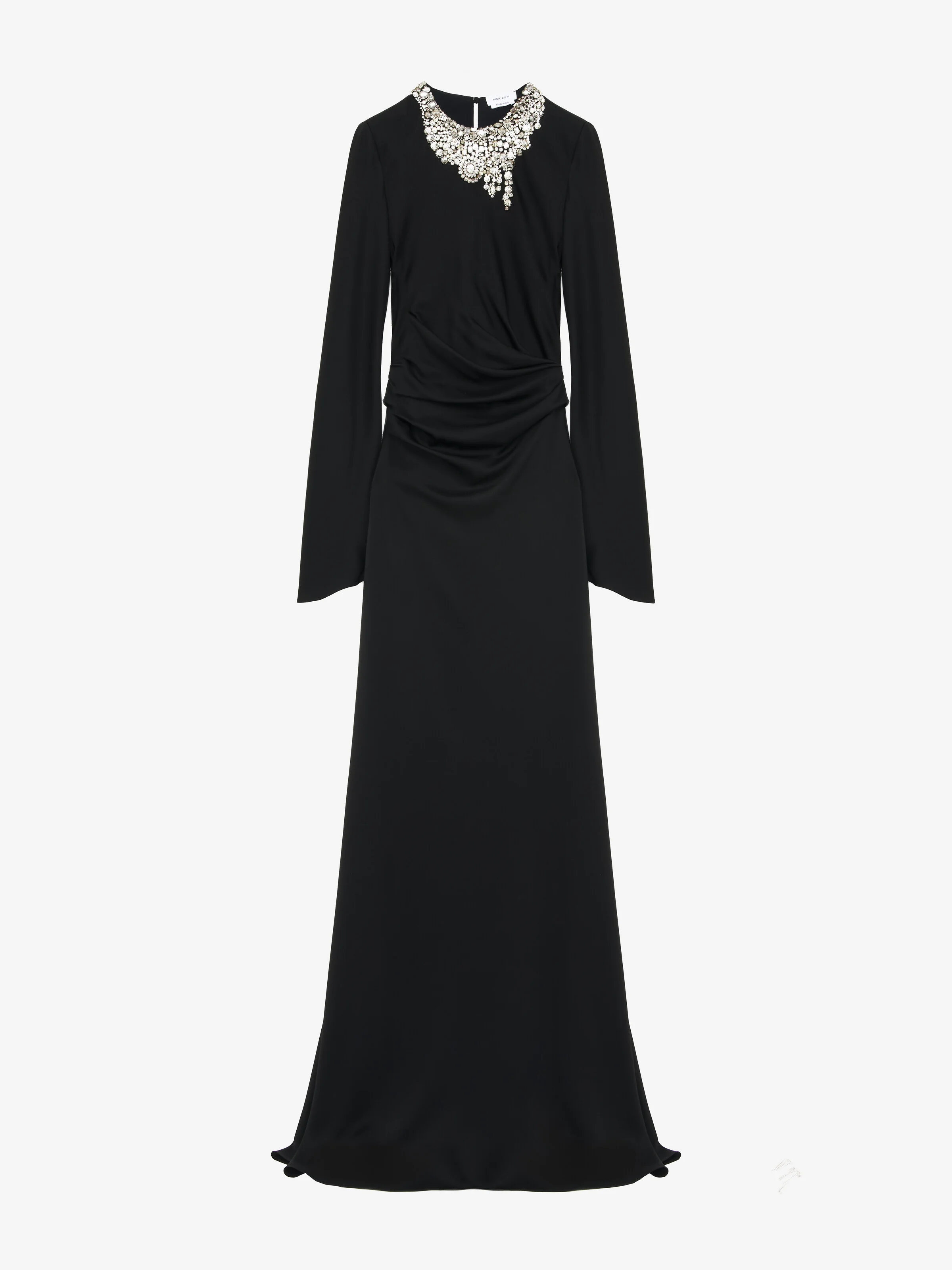 Evening dress in black satin with a necklace-effect Jewelled embroidery around the neck. Long sleeves and drape detailing. Finished with a button-fastening keyhole at the back. Product details - Crew neck - Long sleeves - Button-fastening keyhole - Product code: 859096QZAQT1000 - Made in ITALY - Material: 61% Viscose, 39% Acetate