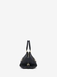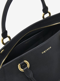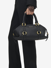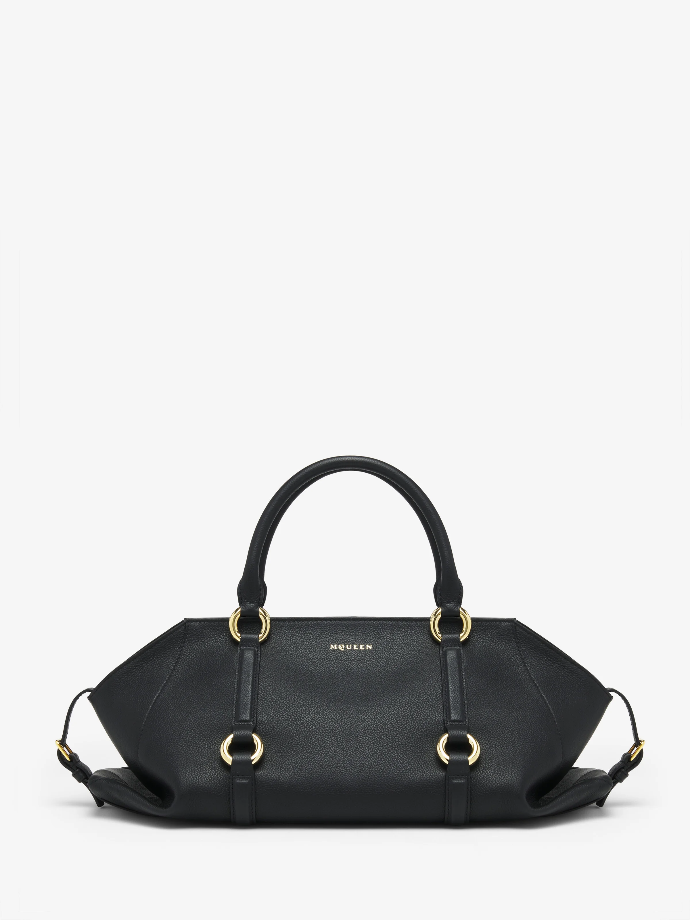 The Farringdon Bag – named after the historic London neighborhood where McQueen's HQ is located. Elongated silhouette crafted from black grainy calf leather with gold metal hardware and leather belt detailing inspired from McQueen's iconic harness belts. The side buckled straps allow to adjust the bag's capacity. This bag can be worn in multiple ways: handheld using the tubular handles or over the shoulder using the detachable leather strap. Product details - Dimensions: Length 44 x Height 20-25 x Depth 12 cm / 17.3 x 7.8-9.8 x 4.7 inches - Adjustable side straps - McQueen logo embossed foil on the front quadrant - Zip fastening - One main compartment with flat leather pocket - Round metal rings with shiny gold finishing - Organic cotton canvas lining - Product code: 8456441VDEB1000 - Made in ITALY - Material: 100% Calf Leather