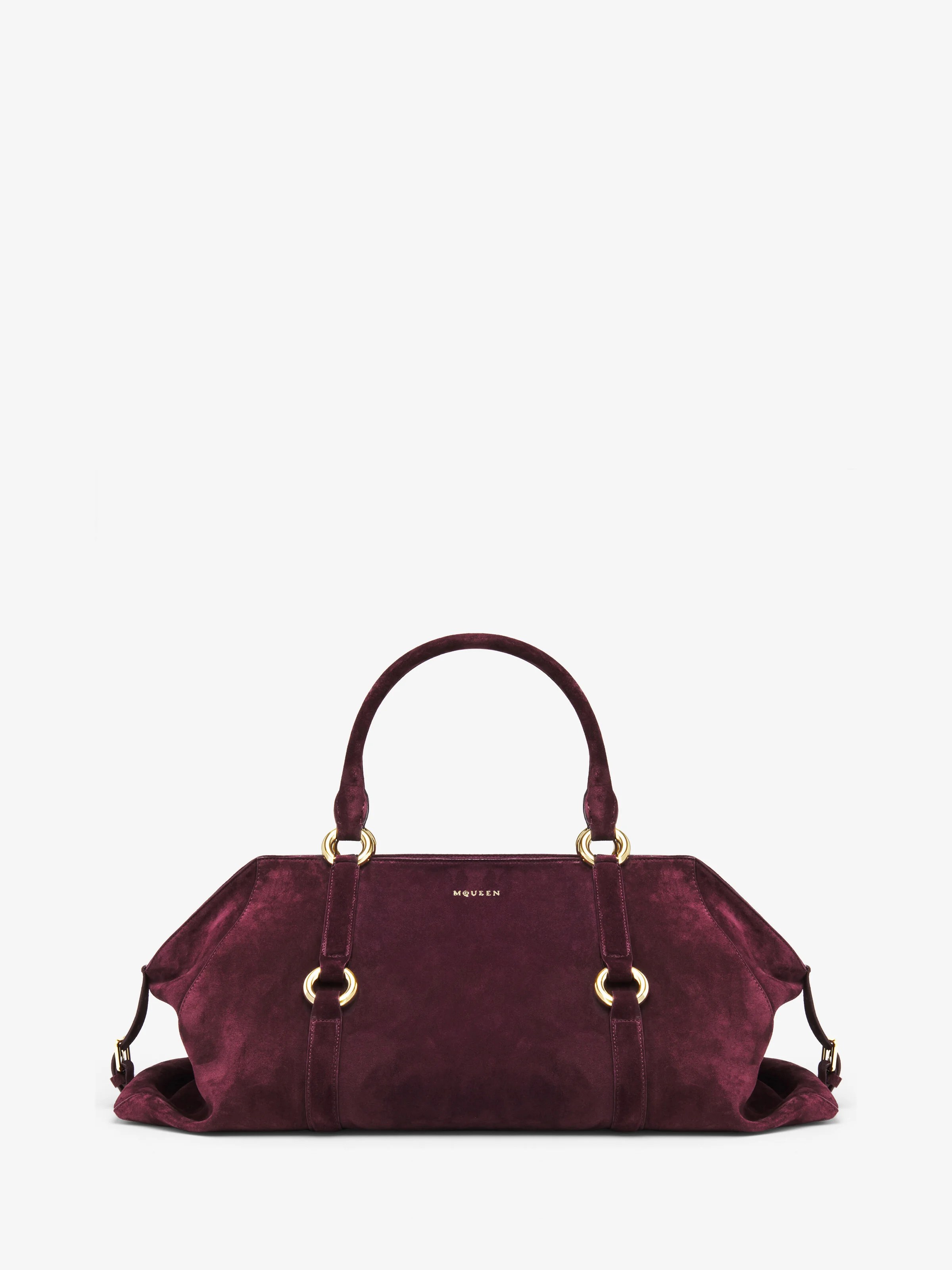 The Farringdon Bag – named after the historic London neighborhood where McQueen's HQ is located. Elongated silhouette crafted from oxblood suede leather with gold metal hardware and leather belt detailing inspired from McQueen's iconic harness belts. The side buckled straps allow to adjust the bag's capacity. This bag can be worn in multiple ways: handheld using the tubular handles or over the shoulder using the detachable leather strap. Product details - Dimensions: Length 44 x Height 20-25 x Depth 12 cm / 17.3 x 7.8-9.8 x 4.7 inches - Adjustable side straps - McQueen logo embossed foil on the front quadrant - Zip fastening - One main compartment with flat leather pocket - Round metal rings with shiny gold finishing - Organic cotton canvas lining - Removable leather handle cover to protect the suede handles - Product code: 8456441MAA56050 - Made in ITALY - Material: 100% Calf Leather