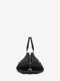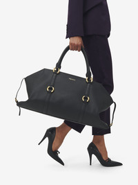 The Farringdon Maxi Bag – named after the historic London neighborhood where McQueen's HQ is located. Elongated silhouette crafted from black supple grainy calf leather with gold metal hardware and leather belt detailing inspired from McQueen's iconic harness belts. The side buckled straps allow to adjust the bag's capacity. This bag can be worn handheld or on the shoulder using the tubular handles. Product details - Dimensions: Length 60 x Height 24-33 x Depth 17 cm / 23.6 x 9.4-12.9 x 6.6 inches - Adjustable side straps - McQueen logo embossed foil on the front quadrant - Zip fastening - One main compartment with zip pocket - Round metal rings with shiny gold finishing - Organic cotton canvas lining - Product code: 8456431VDEB1000 - Made in ITALY - Material: 100% Calf Leather