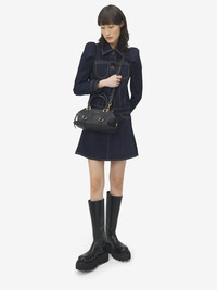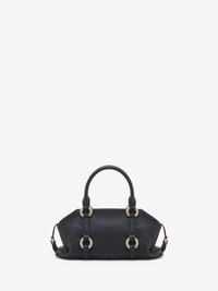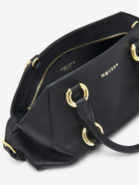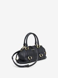 The Farringdon Small Bag – named after the historic London neighborhood where McQueen's HQ is located. Elongated silhouette crafted from black grainy calf leather with gold metal hardware and leather belt detailing inspired from McQueen's iconic harness belts. The side buckled straps allow to adjust the bag's capacity. This bag can be worn in multiple ways: handheld using the tubular handles or over the shoulder or across the body using the detachable leather strap. Product details - Dimensions: Length 31 x Height 14-17.5 x Depth 8.5 cm / 12.2 x 5.5-6.8 x 3.3 inches - Adjustable side straps - McQueen logo embossed foil on the front quadrant - Zip fastening - One main compartment with flat leather pocket - Round metal rings with shiny gold finishing - Organic cotton canvas lining - Product code: 8515961VDEB1000 - Made in ITALY - Material: 100% Calf Leather