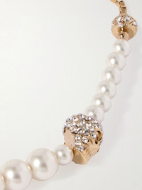 McQueen's necklace features the house's signature skulls sprinkled with glistening crystals. Bringing a subversive edge to a classic style, it contrasts a strand of lustrous faux pearls and gold-tone chain. Details & Care - Lobster clasp fastening