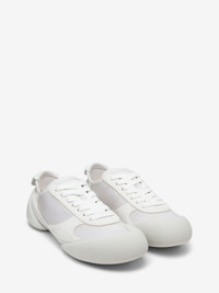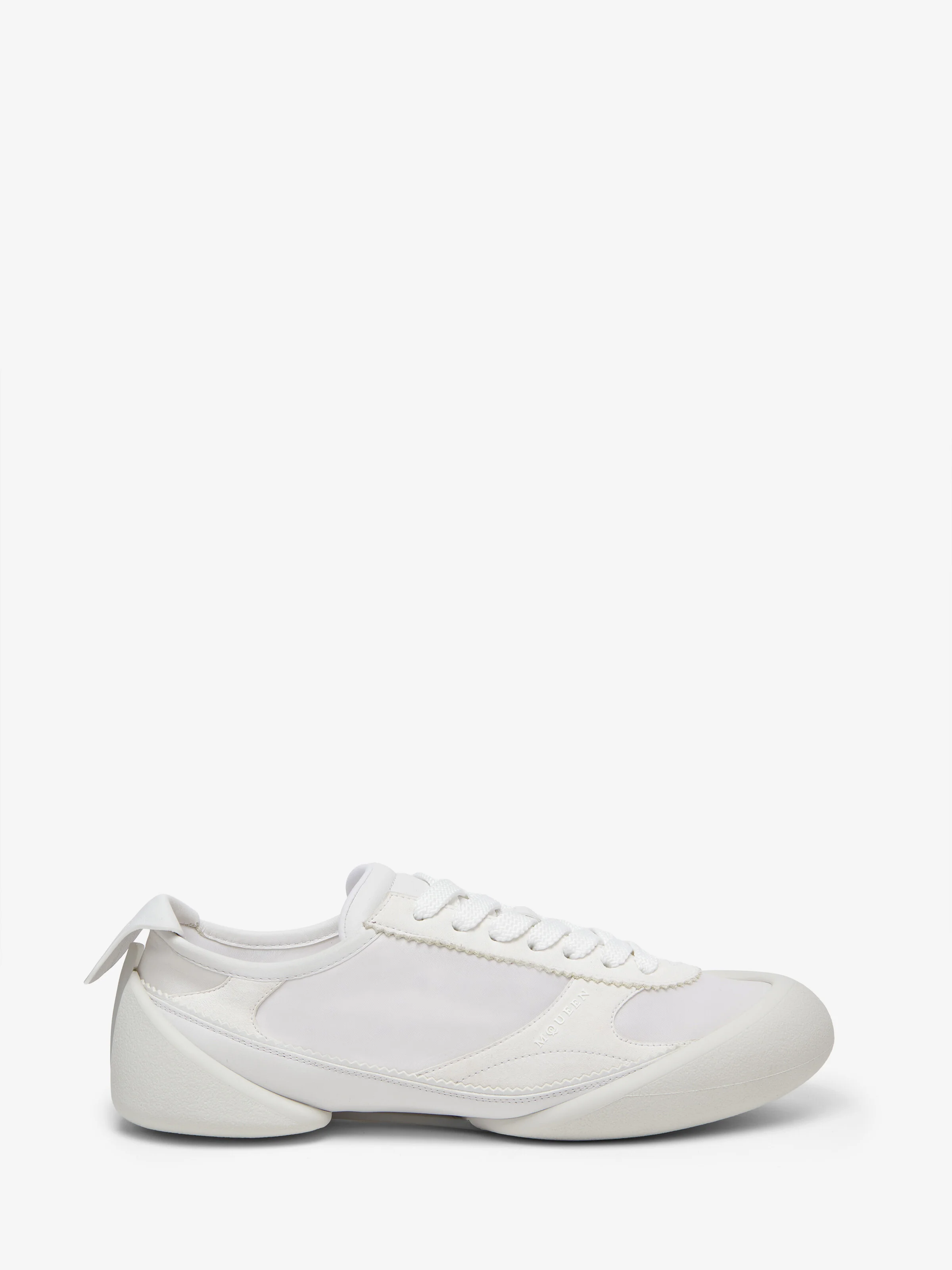 The Flexion sneaker - Vintage-inspired silhouette combined with modern innovation. Slim profile ergonomic design with an anatomical feel. White calf leather and suede with tonal shoelaces and a lightweight split sole. Product details - Lace-up closure - McQueen signature - Round toe - Lightweight split sole - Product code: 828616W4AAT9029 - Made in Italy - Material: Polyurethane