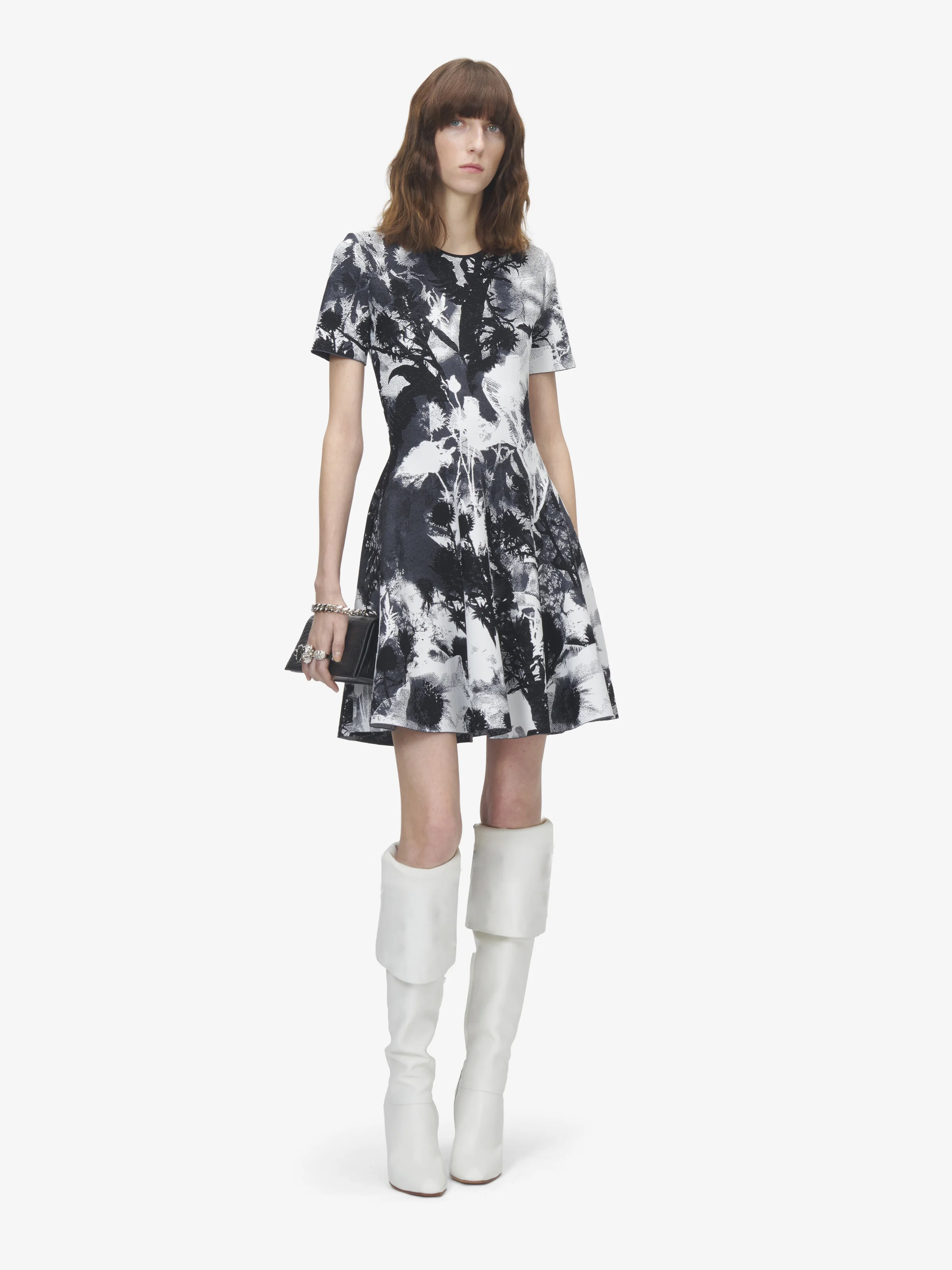 Fit and flare mini dress in ivory and black Floral viscose jacquard. Crew neck, short sleeves and back zip fastening. Product details - Crew neck - Short sleeves - Back zip fastening - Product code: 870367Q1BG49009 - Made in ITALY - Material: 76% Viscose, 16% Polyester, 6% Polyamide, 2% Elastane