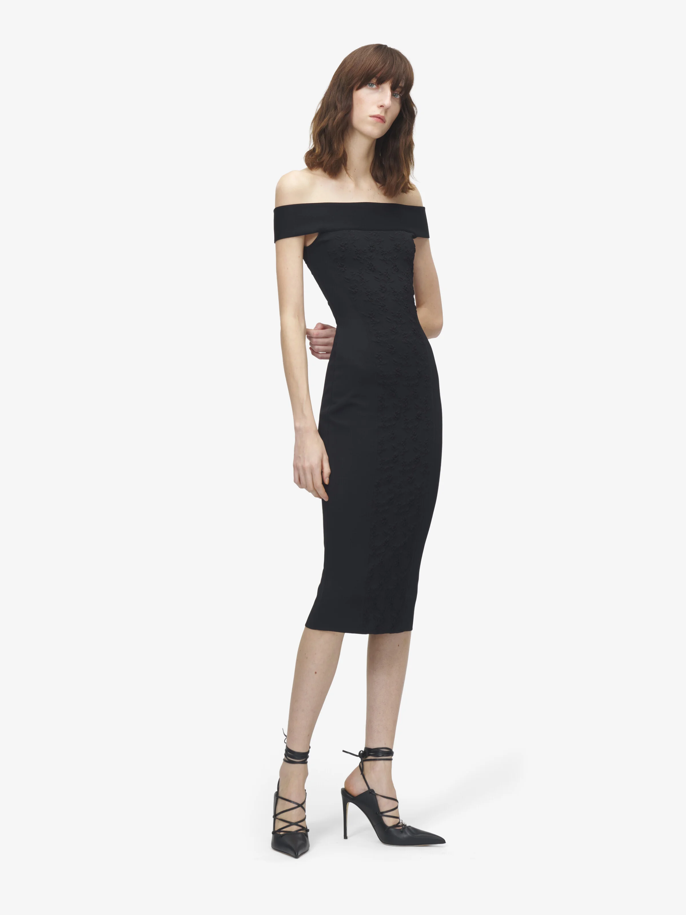 Off-the-shoulder pencil dress in black shiny viscose floral jacquard. Finished with a side zip fastening. Product details - Side zip fastening - Product code: 870413Q1BG21000 - Made in ITALY - Material: 77% Viscose, 15% Polyamide, 7% Polyester, 1% Elastane