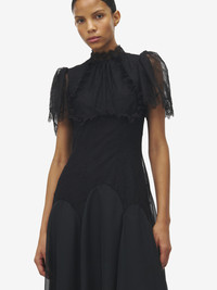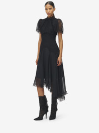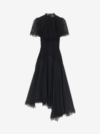 Victorian-inspired asymmetric evening dress in black chiffon and floral lace. High neck, short sleeves and corset detailing. Finished with a back zip fastening. Product details - High neck - Short sleeves - Back zip fastening - Product code: 843633QZAPW1000 - Made in ITALY - Material: 61% Polyamide, 39% Viscose