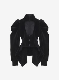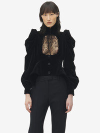 Black cotton velvet jacket featuring a sheer floral lace panel on the chest. High collar, long puff sleeves and flared hem. Finished with a front button fastening. Product details - High collar - Long puff sleeves - Front button fastening - Product code: 849830QFABM1000 - Made in ITALY - Material: 100% Cotton