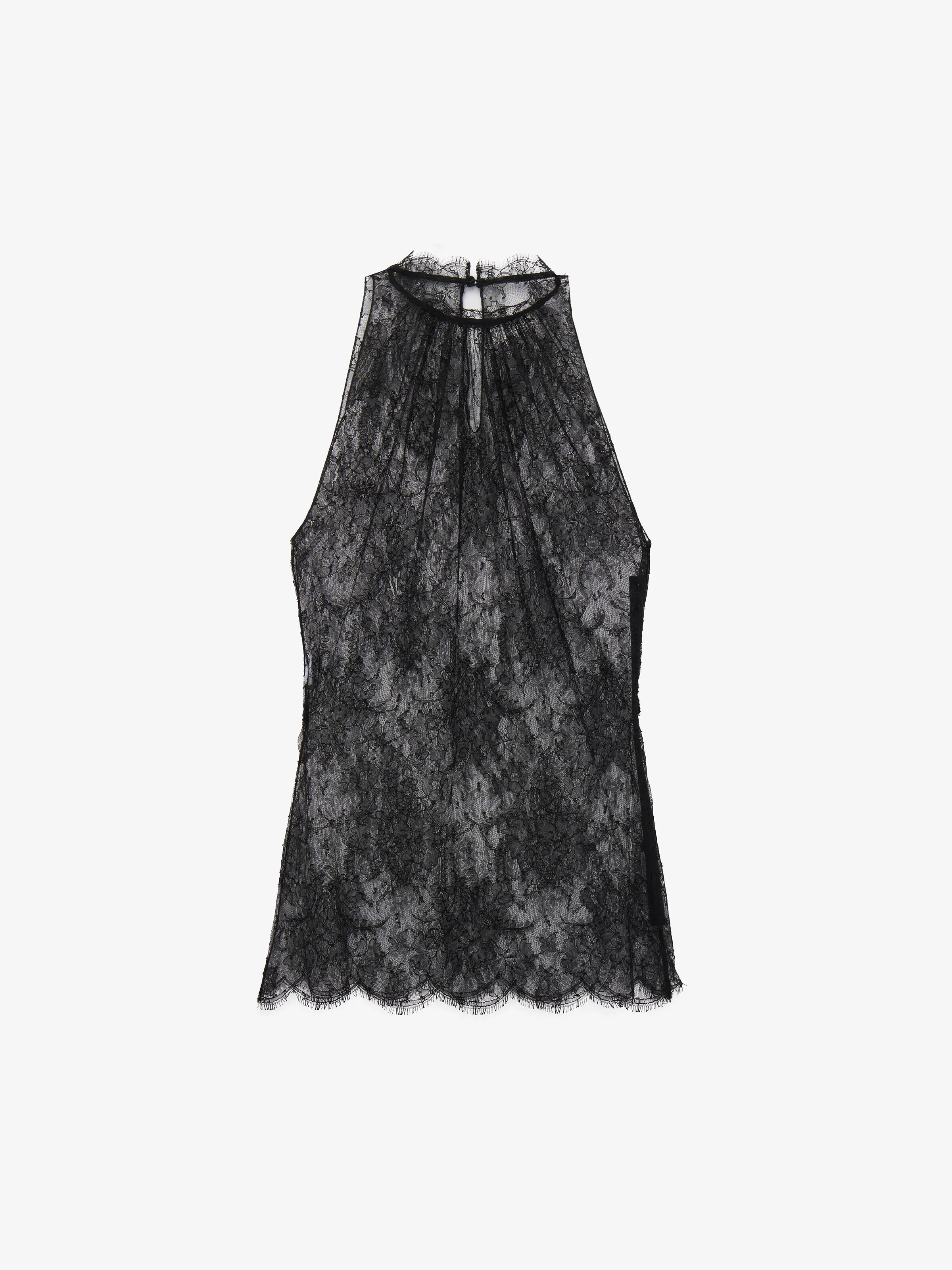 Black floral lace sleeveless top. Crew neck with scalloped trim and gathered detailing on the chest. Finished with a button-fastening keyhole at the back. Product details - Crew neck - Button-fastening keyhole - Product code: 849852QZAPW1000 - Made in ITALY - Material: 61% Polyamide, 39% Viscose