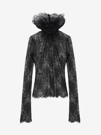 Black floral lace top featuring a high-neck collar and long sleeves. Finished with a back hook and eye fastening. Product details - Exploded collar - Long sleeves - Back hook and eye fastening - Product code: 849834QZAPW1000 - Made in ITALY - Material: 61% Polyamide, 39% Viscose
