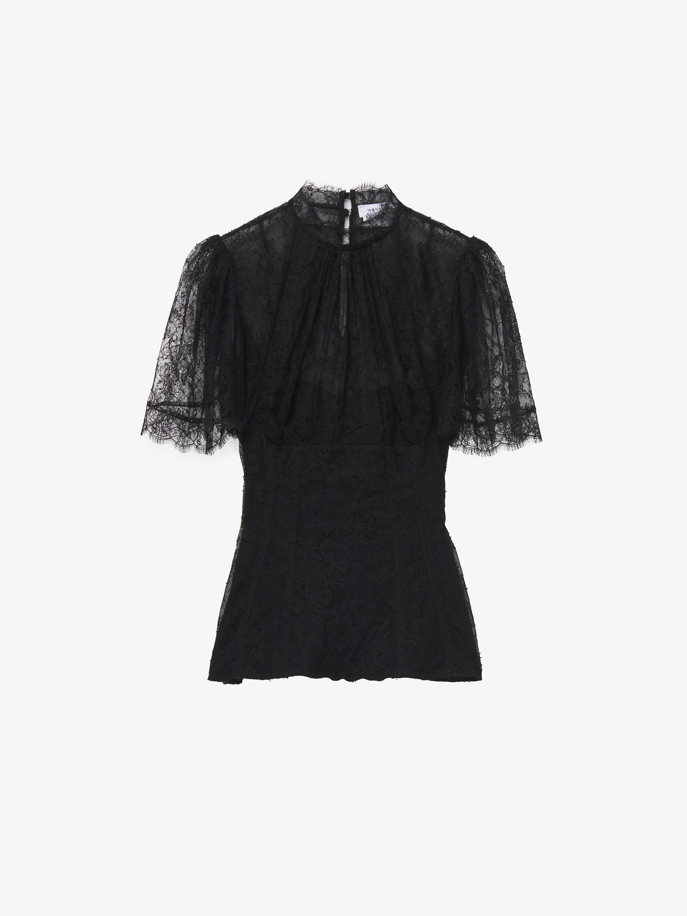 Victorian-inspired top in black floral lace. High neck, short sleeves and corset detailing. Finished with a button-fastening keyhole at the back. Product details - High neck - Short sleeves - Button-fastening keyhole - Product code: 843642QZAPW1000 - Made in ITALY - Material: 61% Polyamide, 39% Viscose