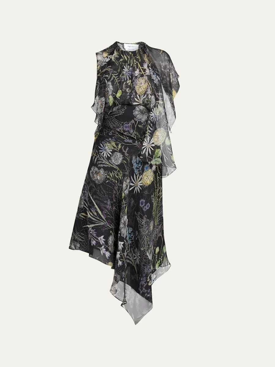 Floral-Print Asymmetric Ruffle Midi Dress