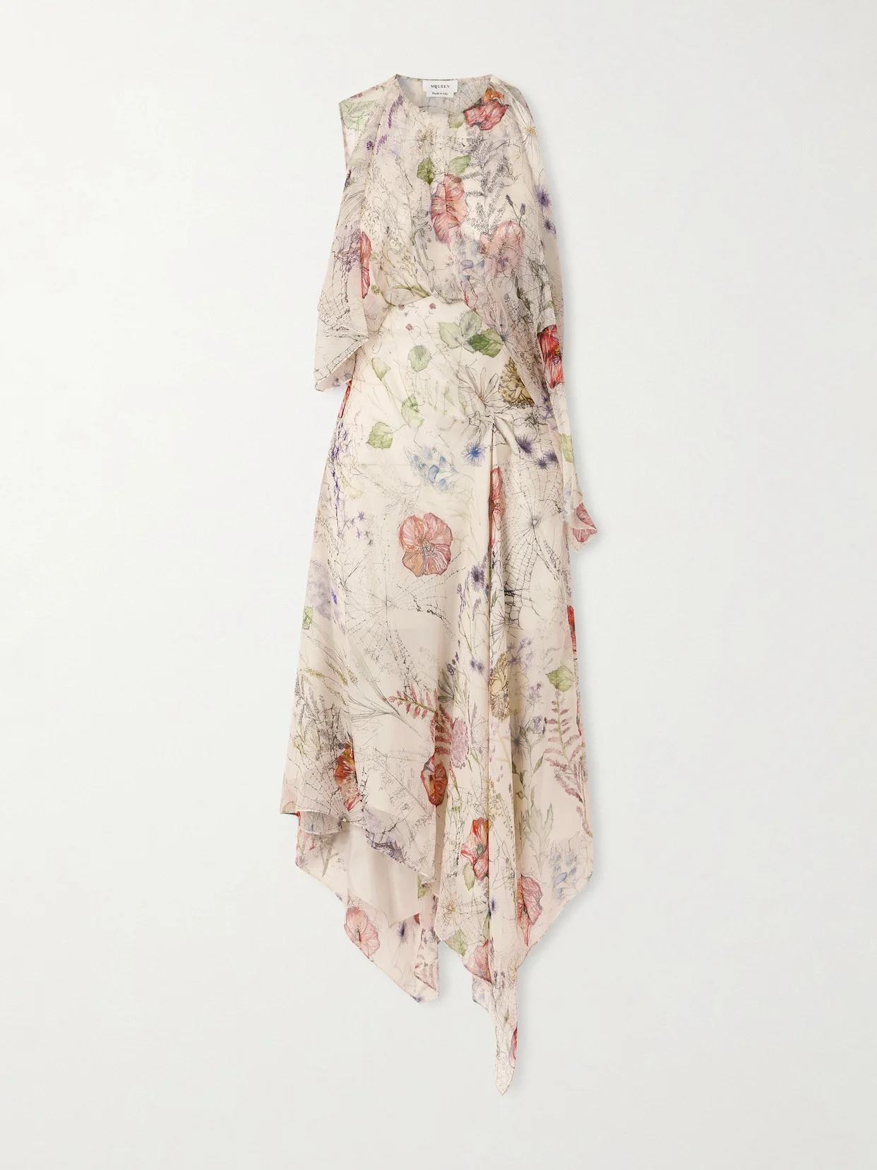 McQueen's midi dress combines pretty flowers with wispy spiderwebs for a gothic twist to the print. Cut from sheer silk chiffon, it's layered and gathered into cascading ruffles with a floaty asymmetric hem.