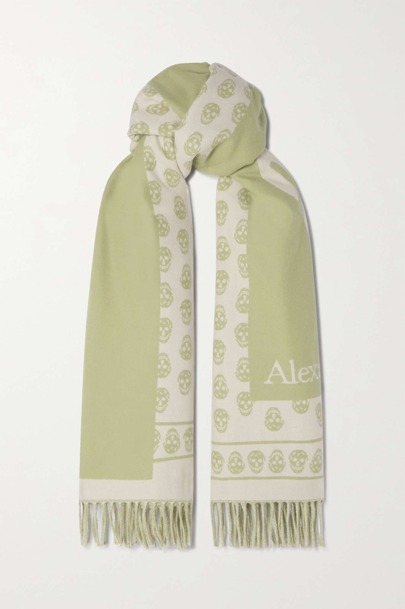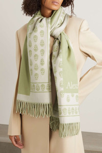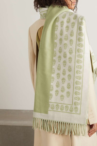 EDITORS'NOTES Alexander McQueen’s skull scarf has earned (and maintained) a devoted following over the years, proving to be a truly timeless accessory. Made from soft ivory and light-green wool-jacquard, this oversized one has long fringed ends. Wear it with a blazer or biker jacket. SIZE & FIT This item’s measurements are: - Length: - 215cm - / 84.6in - Height: - 70cm - / 27.6in DETAILS & CARE - Ivory and light-green wool - 100% wool - Dry clean