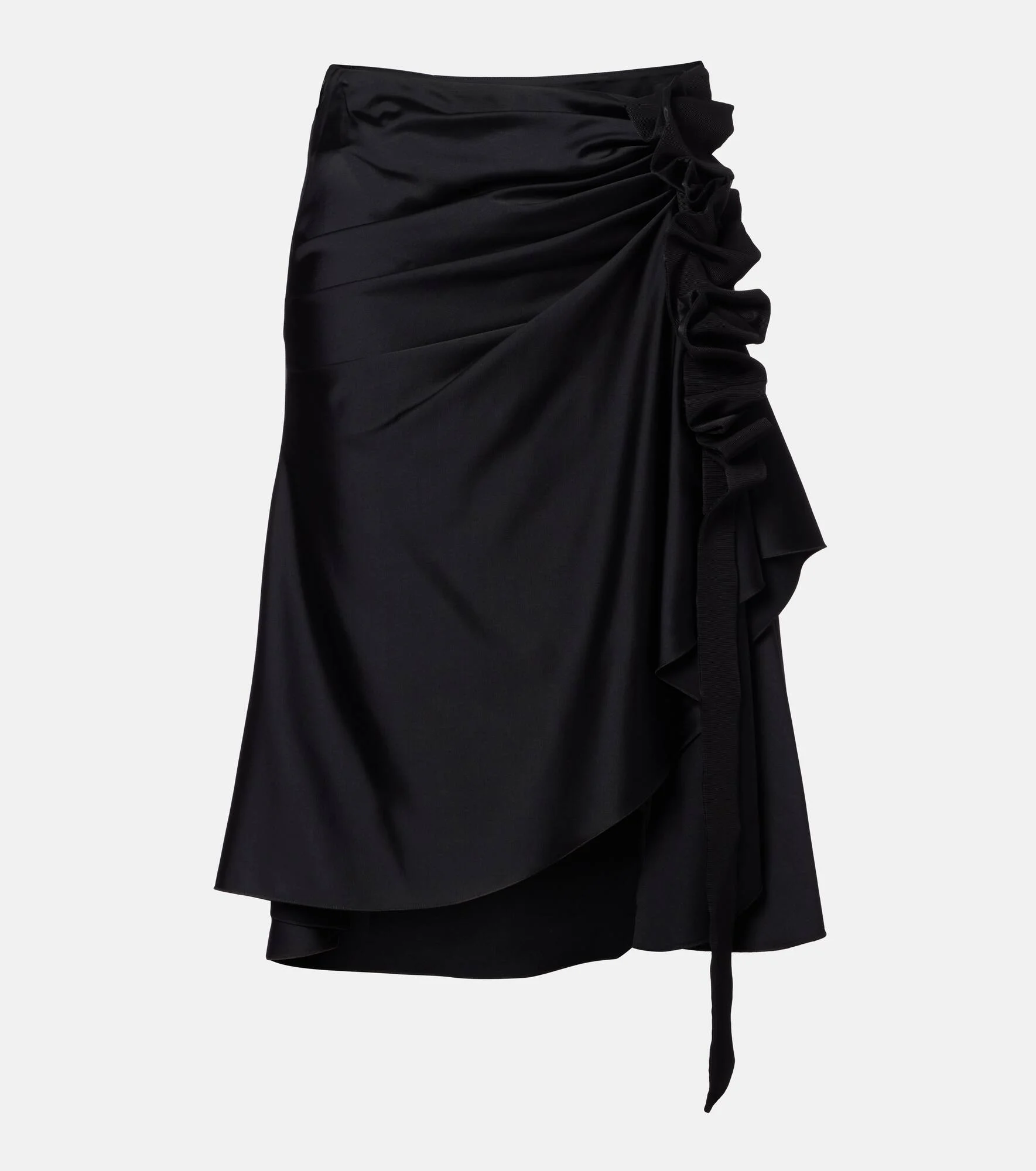 This midi skirt from McQueen is primed for everyday looks, special occasion ensembles, and everything in between. Featuring an asymmetric hemline, the gathered style is defined by ruffle details on the side. Product Details - Material: 73% viscose, 24% wool, 3% elastane - Care instructions: dry clean - Made in Italy - Designer color name: Black - Item color: black - Details: 100% polyester - Details II: 66% cotton, 34% viscose - Closure: concealed zipped side - Item number: P01121687 Size & Fit - True to size - Non-stretchy fabric - Sits low on the hips - The model seen in the picture is 178cm-5'10" and wearing a size IT 40