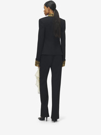 Cutaway jacket in black stretch wool gabardine. Stand collar with gold bullion and turn-up cuffs with floral bullion and sequins embroidery. Product details - Standing collar - Front hook fastening - Product code: 848858QJAFK1000 - Made in ITALY - Material: 98% Wool, 2% Elastane