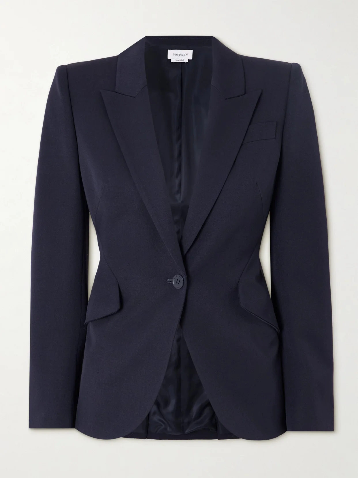 McQueen's namesake founder, Lee Alexander, earned his stripes on Savile Row as an apprentice tailor and pattern cutter for some of the best in the industry. Honoring his legacy, this blazer has a signature, structured shape with strong, padded shoulders and a narrow, tucked-in waist. It's made from grain de poudre wool and fully lined for easy layering.