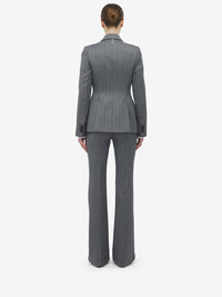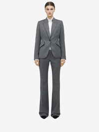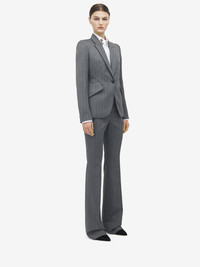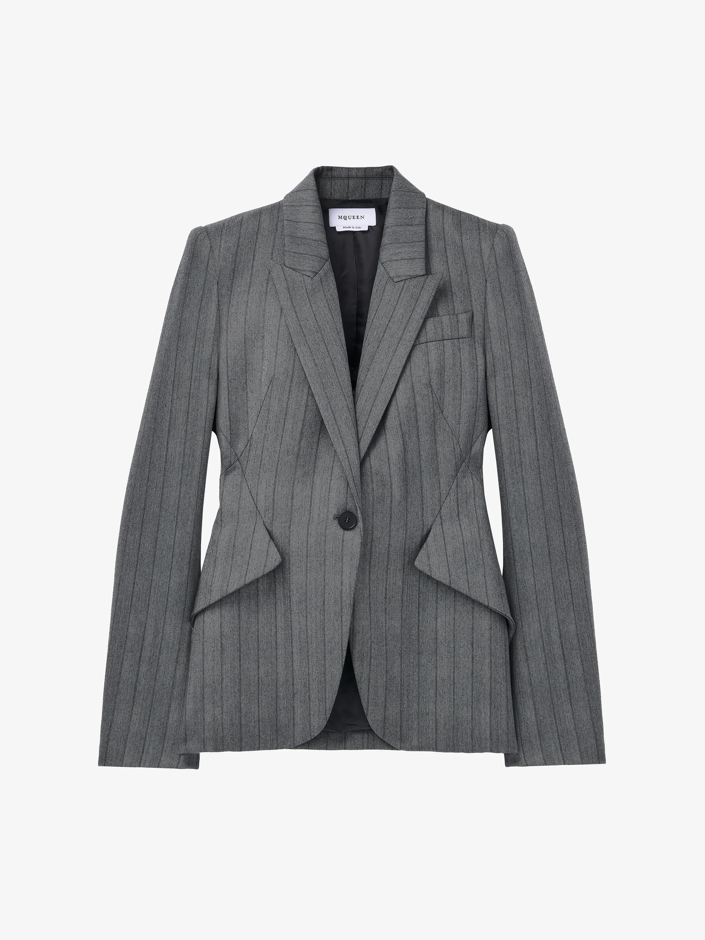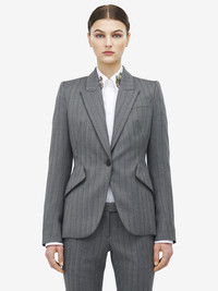 Fitted single-breasted jacket in grey herringbone stripe suiting. Peak lapels, side flap pockets and single button fastening. Finished with a T-bar chain back detail. Product details - Peak lapels - Side flap pockets - Single button fastening - Product code: 839134QJAFE1121 - Made in Italy - Material: 100% Wool
