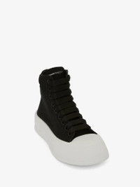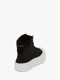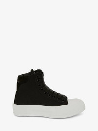 Black canvas high-top Deck Plimsoll with a thick oversized rubber sole. The lace-up is detailed with a rubber wrap sole and tonal Alexander McQueen signature, finished with a suede heel counter. Round toe shape silhouette details rubber toe cap. Material:100% Cotton Product Code:666381W4MV71070