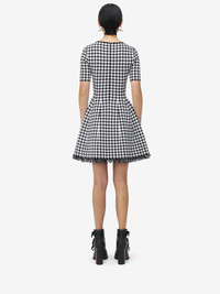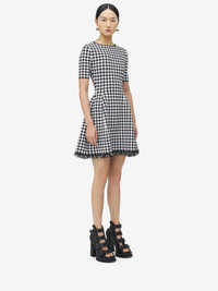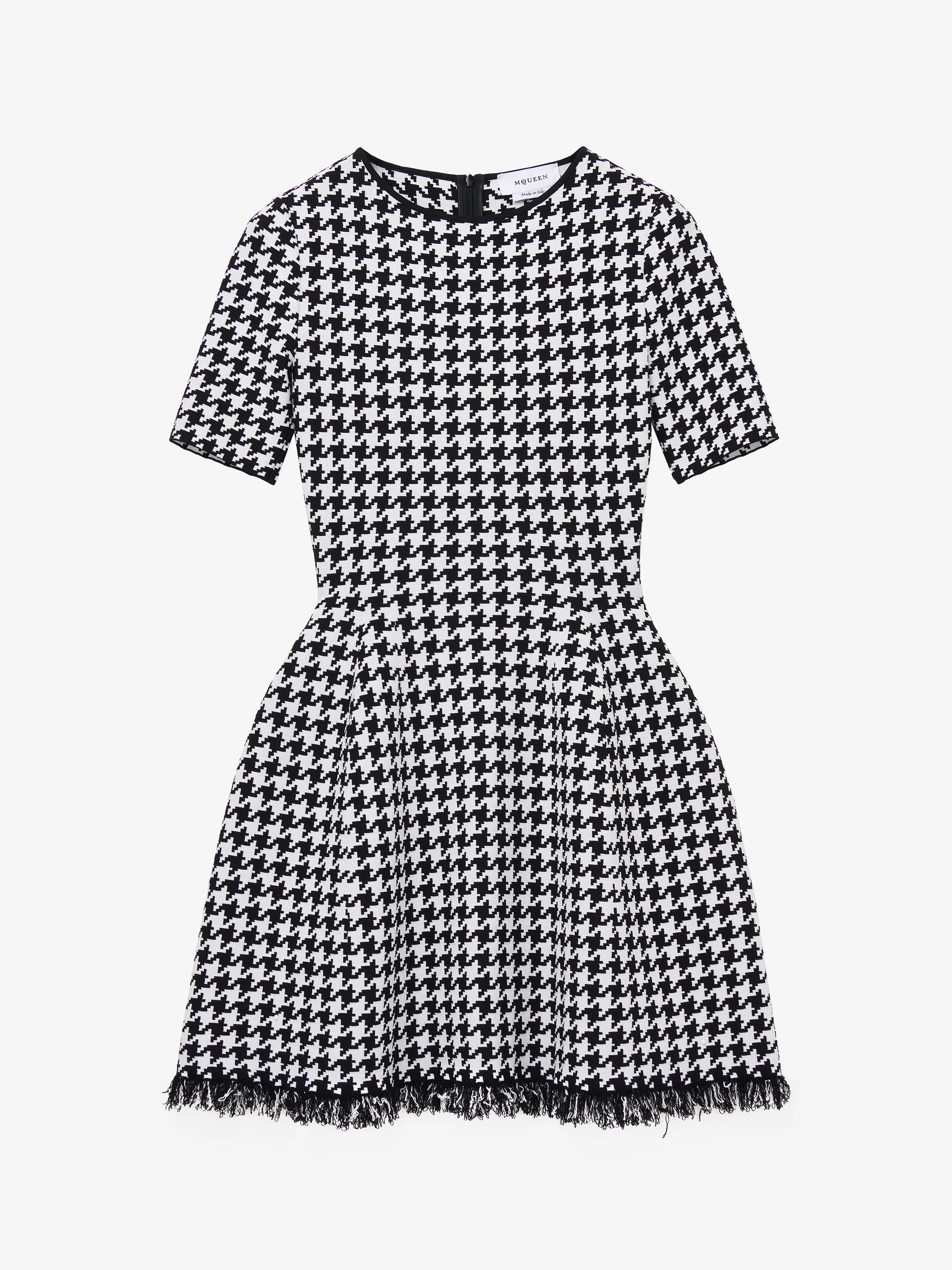 Mini dress in black and ivory houndstooth jacquard. Crew neck, short sleeves, pannier skirt and frayed edges. Finished with a back zip fastening. Product details - Crew neck - Short sleeves - Pannier skirt - Back zip fastening - Made with certified viscose yarn - Product code: 829320Q1BDB1080 - Made in Italy - Material: 77% Viscose, 16% Polyester, 5% Polyamide, 2% Elastane