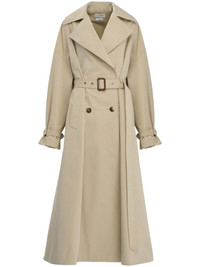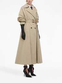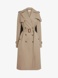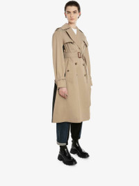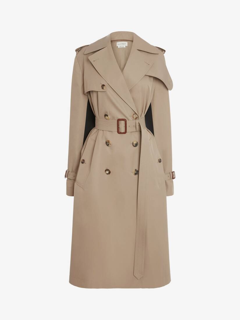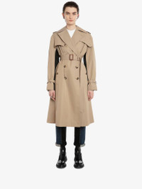 Beige classic trench coat in cotton gabardine spliced with contrast black self-fabric back featuring a printed McQueen Graffiti logo. Finished with horn buttons and a leather belt buckle. Material:100% Cotton Product Code:666921QFAAA0807