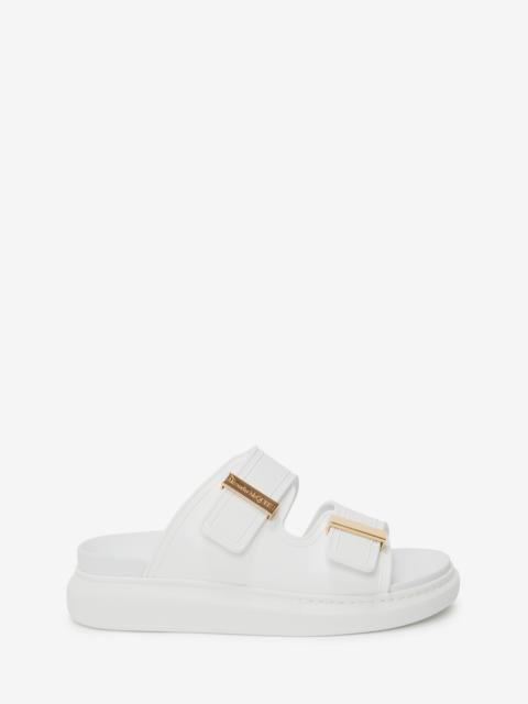 The Hybrid Slide—snow and black rubber with a round toe silhouette and a double strap construction. Detailed with gold-finished bars engraved with the McQueen signature and an oversized rubber sole. Product details - Round toe - Gold-finished hardware - Embossed McQueen signature on the upper - Oversized rubber sole - Sole height: 35 mm (1.3 inches) / insole 15 mm (0.5 inches) - Product code: 658063W4Z529521 - Made in Italy - Material: Rubber