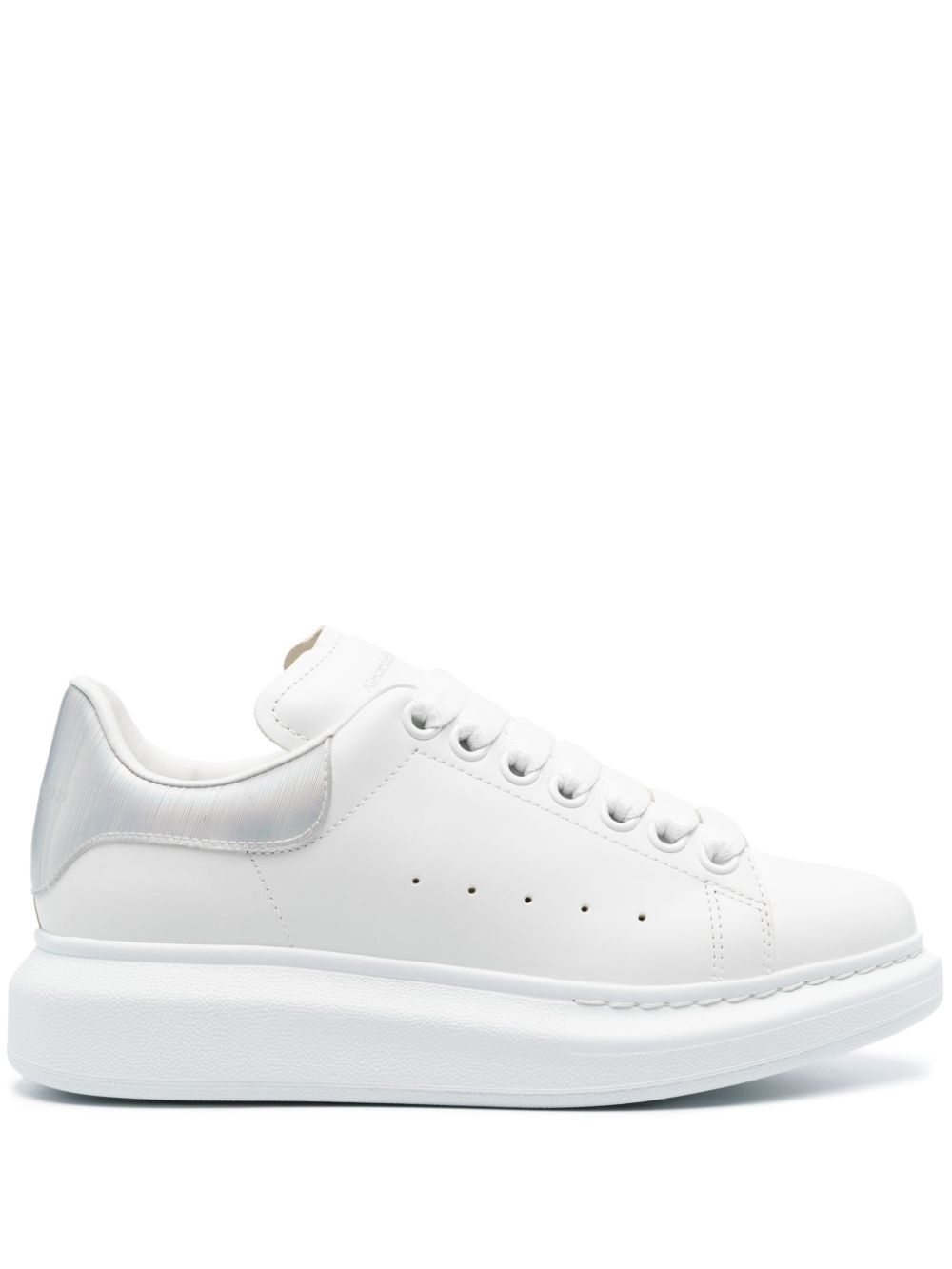 iridescent-panel leather sneakers Alexander McQueen's Oversized sneaker family is distinguished by its branded heel counter and namesake rubber soles. This pair is crafted from white leather with a wavy iridescent insert that wraps around the collar. Highlights - White/silver-tone - Calf leather - Smooth grain - Perforated detailing to the sides - Iridescent effect to the rear - Logo-print tongue - Logo print to the rear - Logo at the sole - Round toe - Front lace-up fastening - Branded leather insole - Flat rubber sole Made in Italy Composition Sole: Rubber 100% Lining: Calf Leather 100% Outer: Calf Leather 100% SIZE & FIT Measurement HEEL 1.57 in(4 cm) Sole height 1.18 in(3 cm)