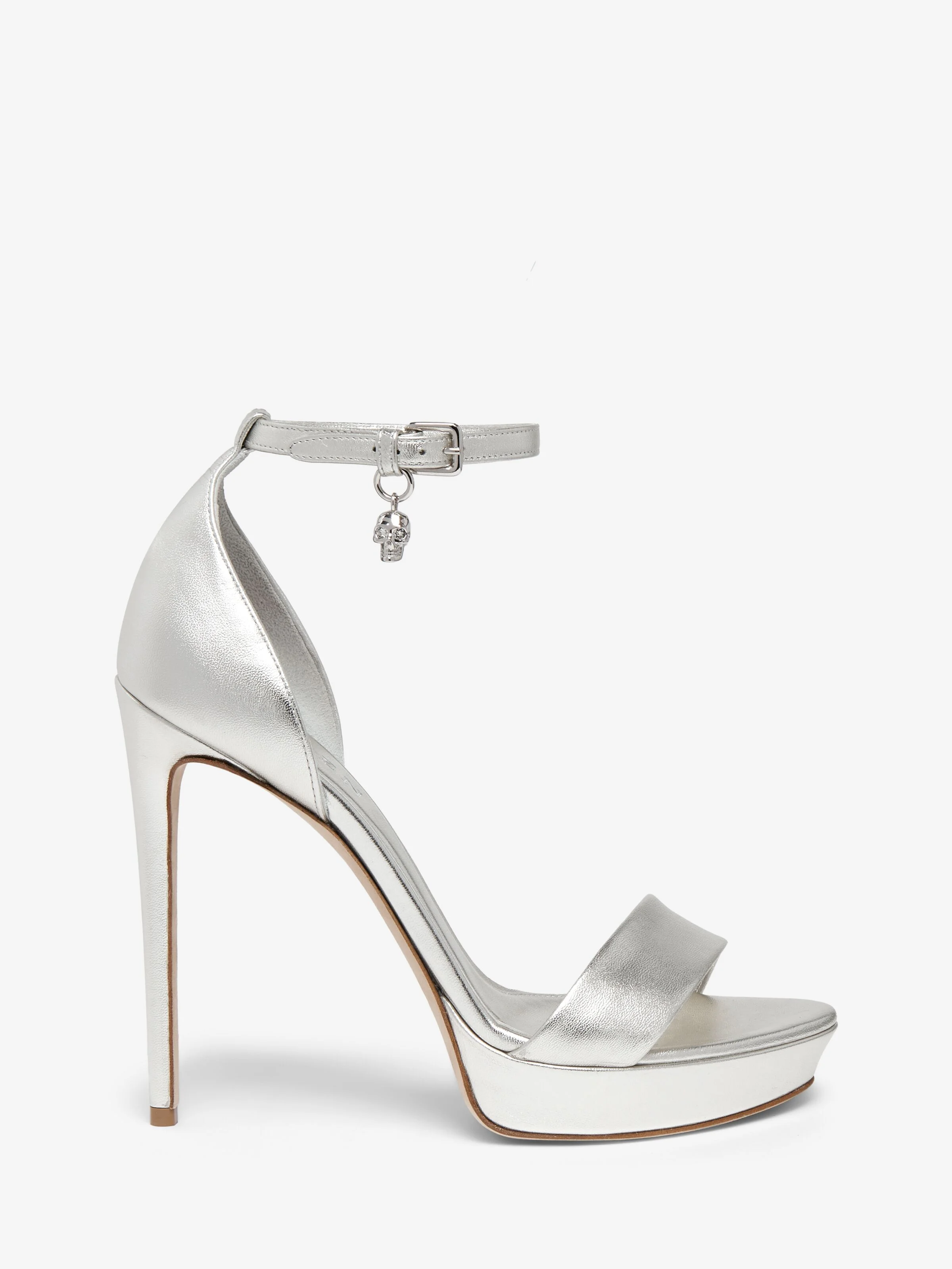 The Jewel Platform Sandal – silver laminated leather with almond toe silhouette and high stiletto heel. Decorative rhinestone brooch on the left shoe upper. Finished with a signature Skull charm hanging from the right ankle strap. Product details - Buckle closure - Almond toe - Stiletto heel - Silver tone metal hardware - Heel height: 125mm / 4.9 inches - Product code: 851992WHAER1500 - Made in ITALY - Material: Lamb Leather