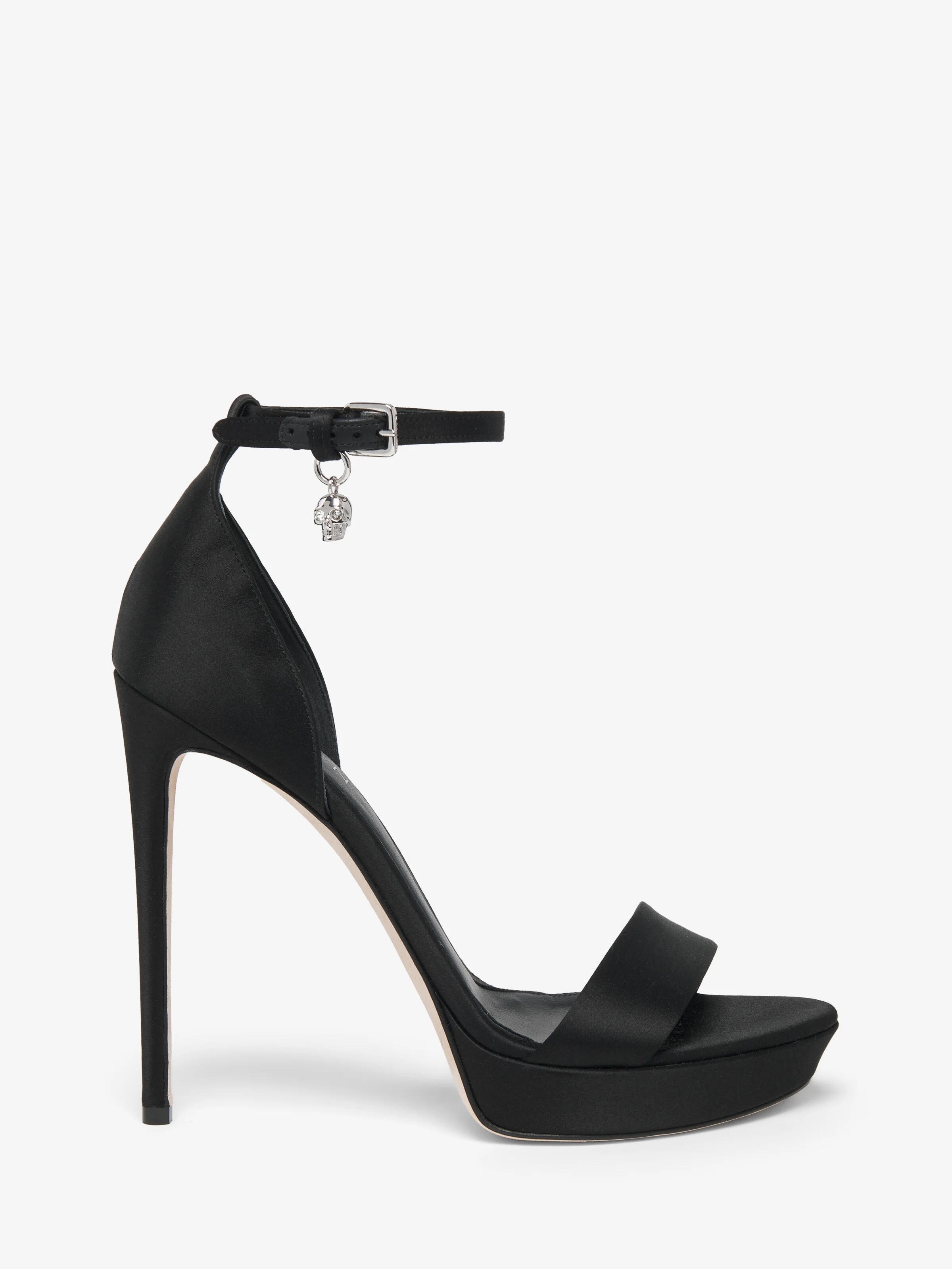 The Jewel Platform Sandal – black satin with almond toe silhouette and high stiletto heel. Decorative rhinestone brooch on the left shoe upper. Finished with a signature Skull charm hanging from the right ankle strap. Product details - Buckle closure - Almond toe - Stiletto heel - Silver tone metal hardware - Heel height: 125mm / 4.9 inches - Product code: 851992W4ABW1000 - Made in ITALY - Material: 72% Viscose, 28% Silk
