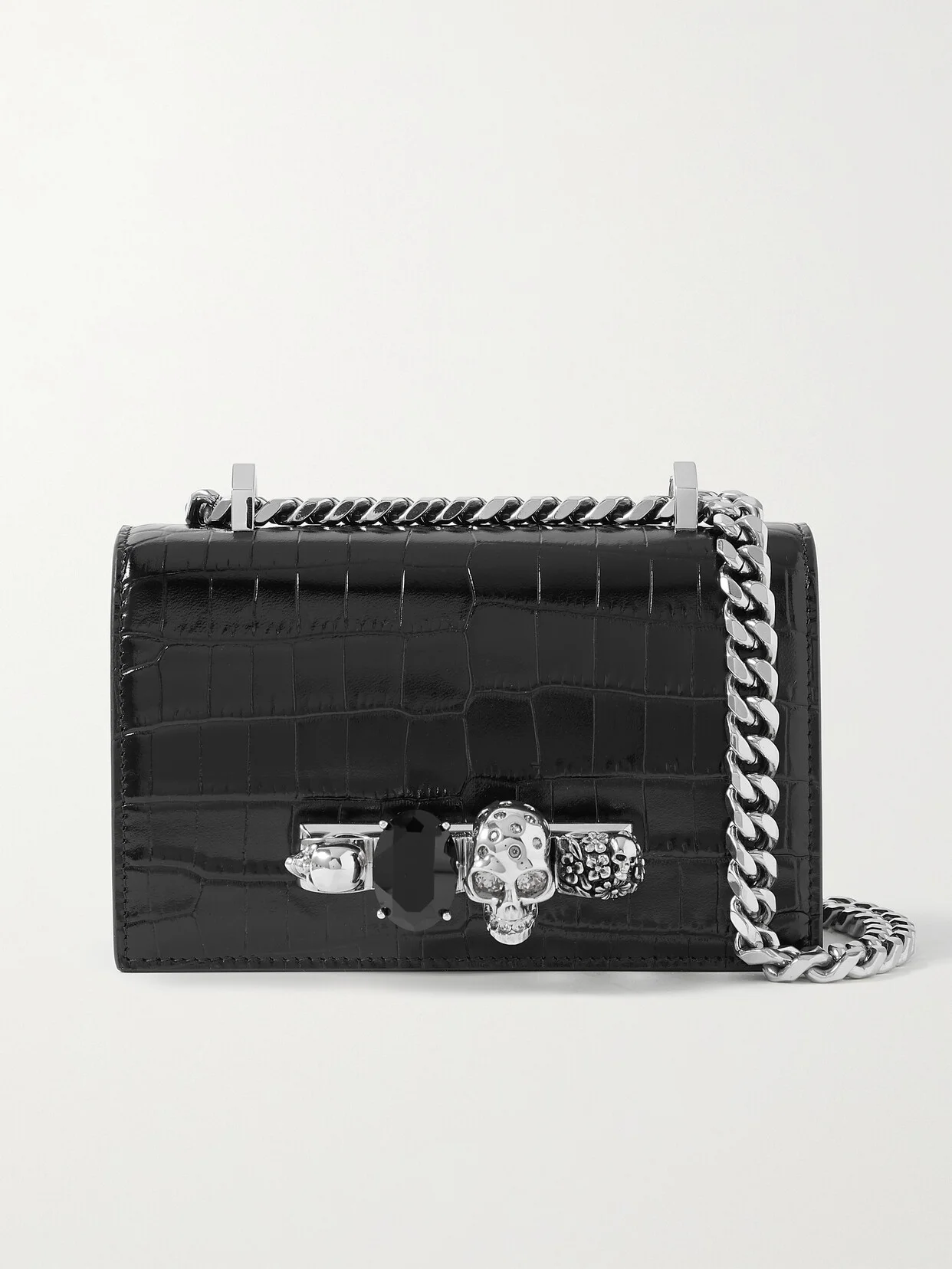 Alexander McQueen's structured shoulder bag is decorated with the label's signature knuckleduster featuring the iconic skull and a sizable faceted crystal. It's been made in Italy from glossy croc-effect leather and has an internal slip pocket to keep small items organized. The chain strap allows you to go hands-free.