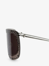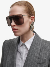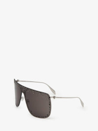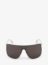 Silver oversized mask sunglasses fitted with solid smoke lenses detailed with crystals and micro studs. The sunglasses feature a 3D skull soldered to the metal temples and are finished with a lasered Alexander McQueen signature. All Alexander McQueen Eyewear is 100% certified UV protective (UVA and UVB rays). Product details - Lenses contain 39% biobased material. - Product code: 649846I33201030 - Made in Italy - Material: Metal