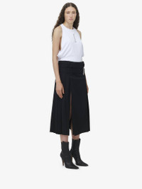 Kilt skirt. Black wool with pleated detail. Finished with signature T-Bar buckle in silver tone metal engraved with the McQueen logo. Product details - Pleat detailing - T-Bar buckle - Two-hooks fastening - Made with certified wool yarn - Product code: 802237QJACA1000 - Made in Italy