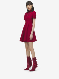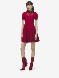 Mini dress in crimson stretch viscose with a sheer lace panel on the chest. Crew neck with frill detailing, short sleeves and flared skirt. Finished with a back zip fastening. Product details - Crew neck - Short sleeves - Back zip fastening - Product code: 848829Q1BE66191 - Made in ITALY - Material: 66% Viscose, 20% Polyamide, 13% Polyester, 1% Elastane