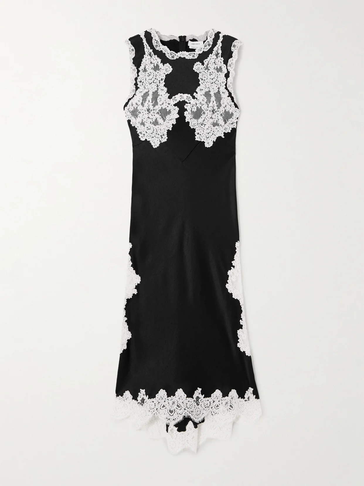 McQueen's dress channels the founder's iconic '90s era, infused with his signature dark romanticism. Taking cues from lingerie, it's made from figure-skimming satin and has contrasting lace trims that reveal peeks of skin.