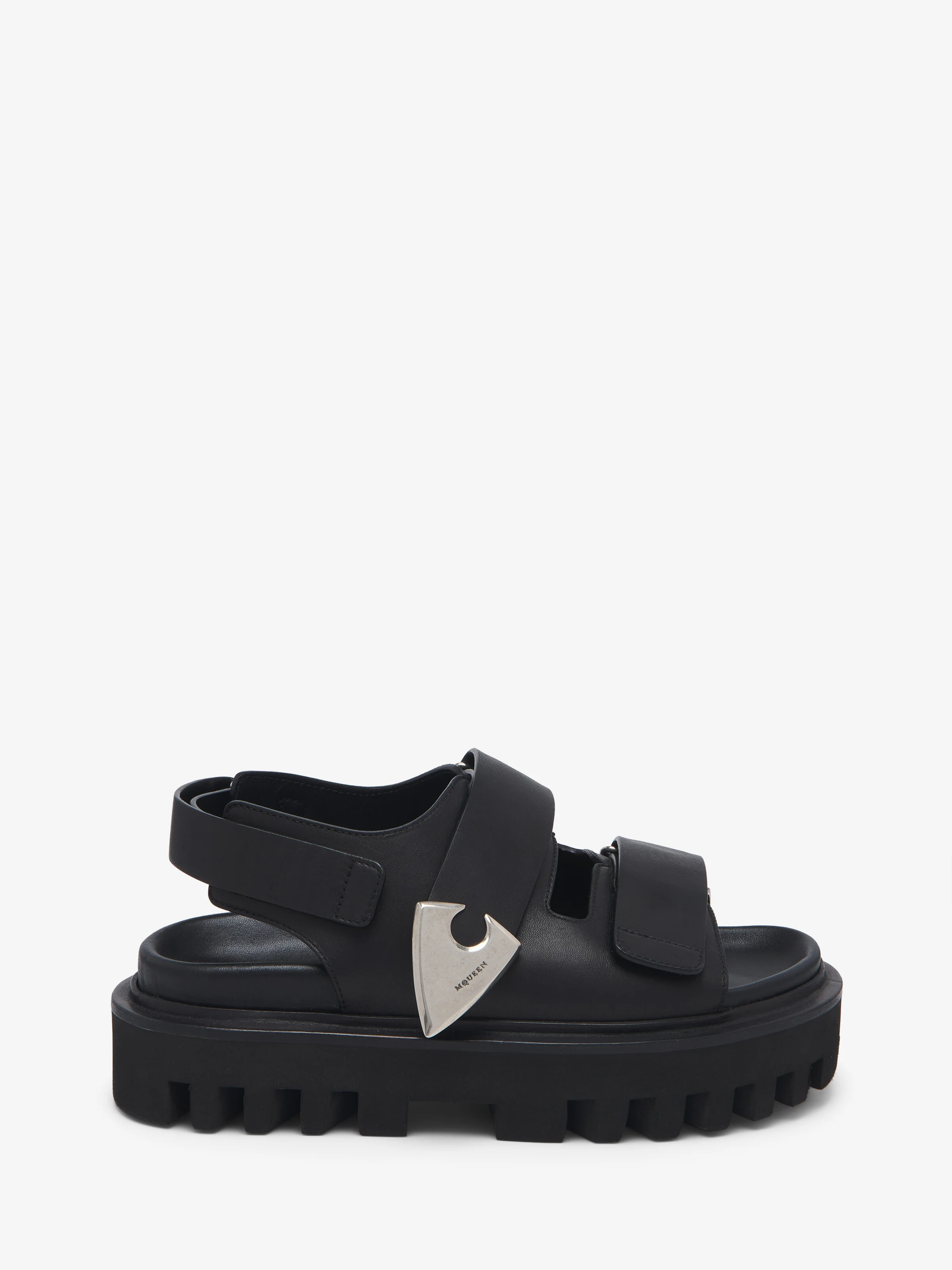 The Parachute Sandal - Black smooth calf leather with a round toe silhouette and a triple straps. Detailed with silver tone metal arrow pin hardware engraved with the McQueen logo and a chunky lug sole. Product details - Round toe - Chunky lug sole - Sole height: 50mm / 1.9 inches including footbed - Product code: 817620WIACT1064 - Made in Italy - Material: Calf Leather