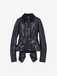Kickback jacket in midnight blue grainy leather with a black corduroy collar. Featuring a zip pocket on the chest, side flap pockets with press-stud closure and kickback detailing with exposed zipper teeth along the edges. Finished with a front zip and button fastening. Product details - Contrast point collar - Side flap pockets - Front zip and button fastening - Product code: 858198Q5AQW4391 - Made in ITALY - Material: 100% Calf Leather