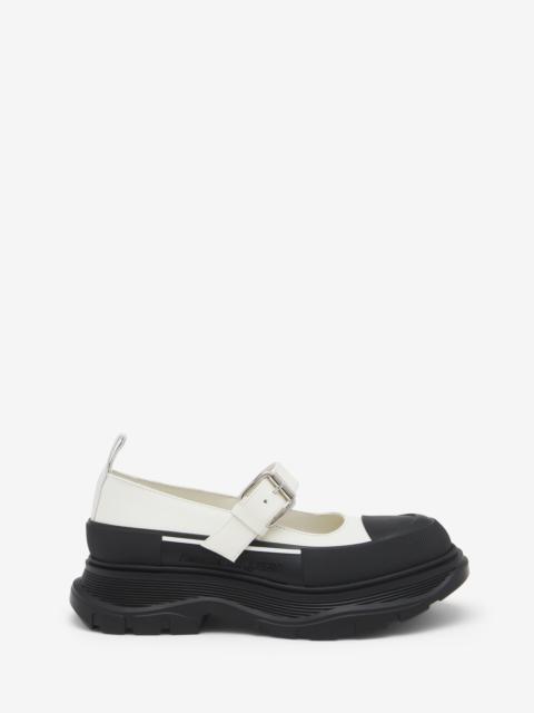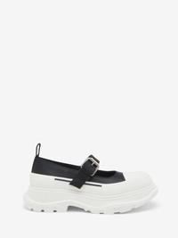 The Thread Slick Mary Jane—black nappa leather with adjustable buckled strap. The shoe is detailed with a textured rubber wrap and a tonal McQueen signature. Finished with a lightweight oversized white rubber tread sole. Product details - Buckle closure - McQueen signature - Round toe - 45mm lightweight rubber tread sole - Product code: 839638WIAGY1021 - Made in ITALY