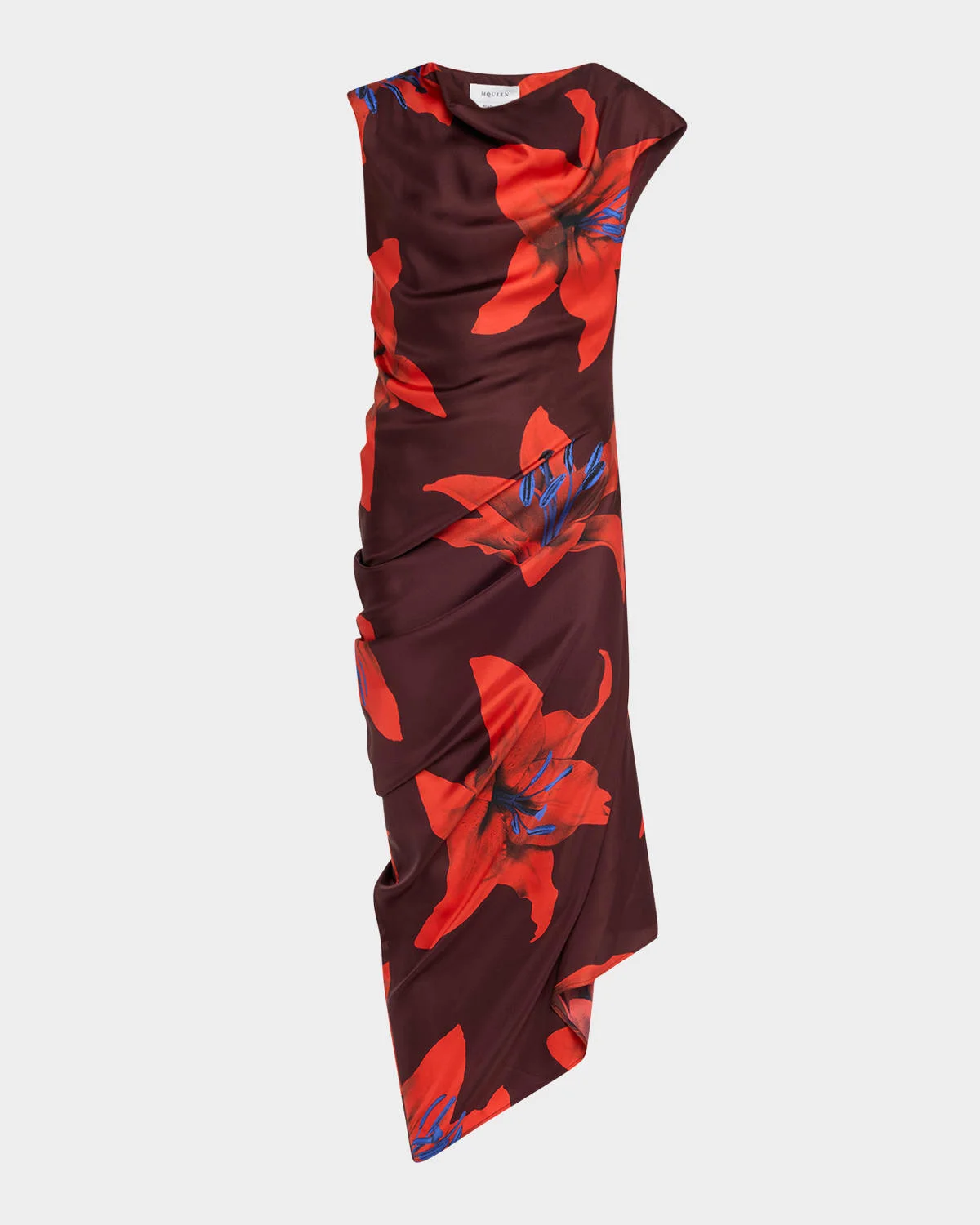 McQueen asymmetric dress featuring draping and a lily print High neckline Cap sleeves Hem falls below the knee Sheath silhouette Highlow hem Hidden closure Silk Dry clean Made in Italy