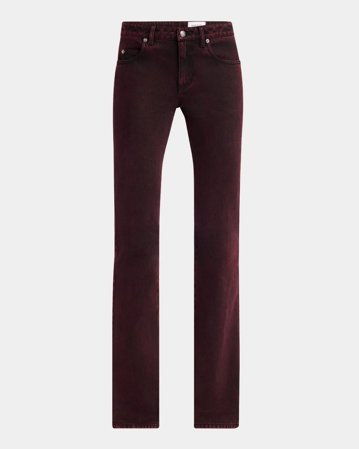 McQueen trousers in a red wash denim Low rise sits at hip Fivepocket style Flared legs Full length Button/zip fly; belt loops Cotton Dry clean Made in Italy