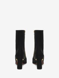 The T-Bar Ankle Boot—black nylon with a soft pointed toe silhouette. Block heel with gold metal T-Bar detailing engraved with the McQueen logo. Finished with a side zipper fastening. Product details - Pointed toe - Side zipper fastening - Leather sole - Heel height: 80 mm / 3.1 inches - Product code: 826515W4ABG1084 - Made in ITALY - Material: 75% Wool, 25% Mohair