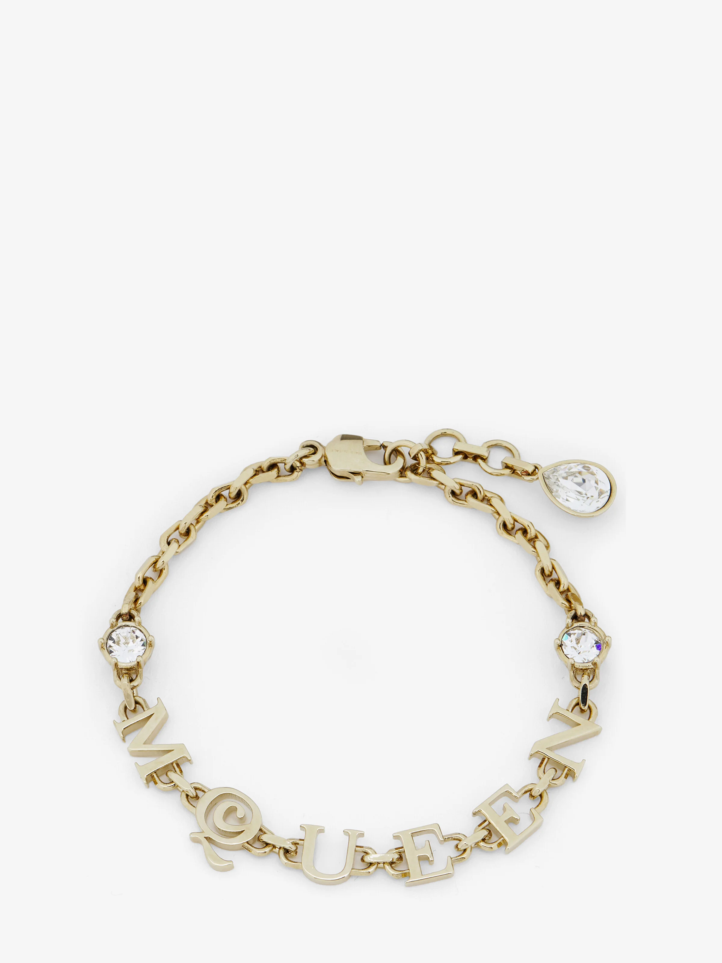 Pale gold-finished chain bracelet featuring a metal McQueen logo and crystal detailing. Lobster clasp closure with crystal charm. Adjustable length. Eco-brass hardware. Product details - Eco-brass hardware - Pale gold finish - Lobster clasp closure - Adjustable length - Total length at first link: 16.5 cm / 6.4 inches - Product code: 836402J161C1035 - Made in Italy - Material: Brass
