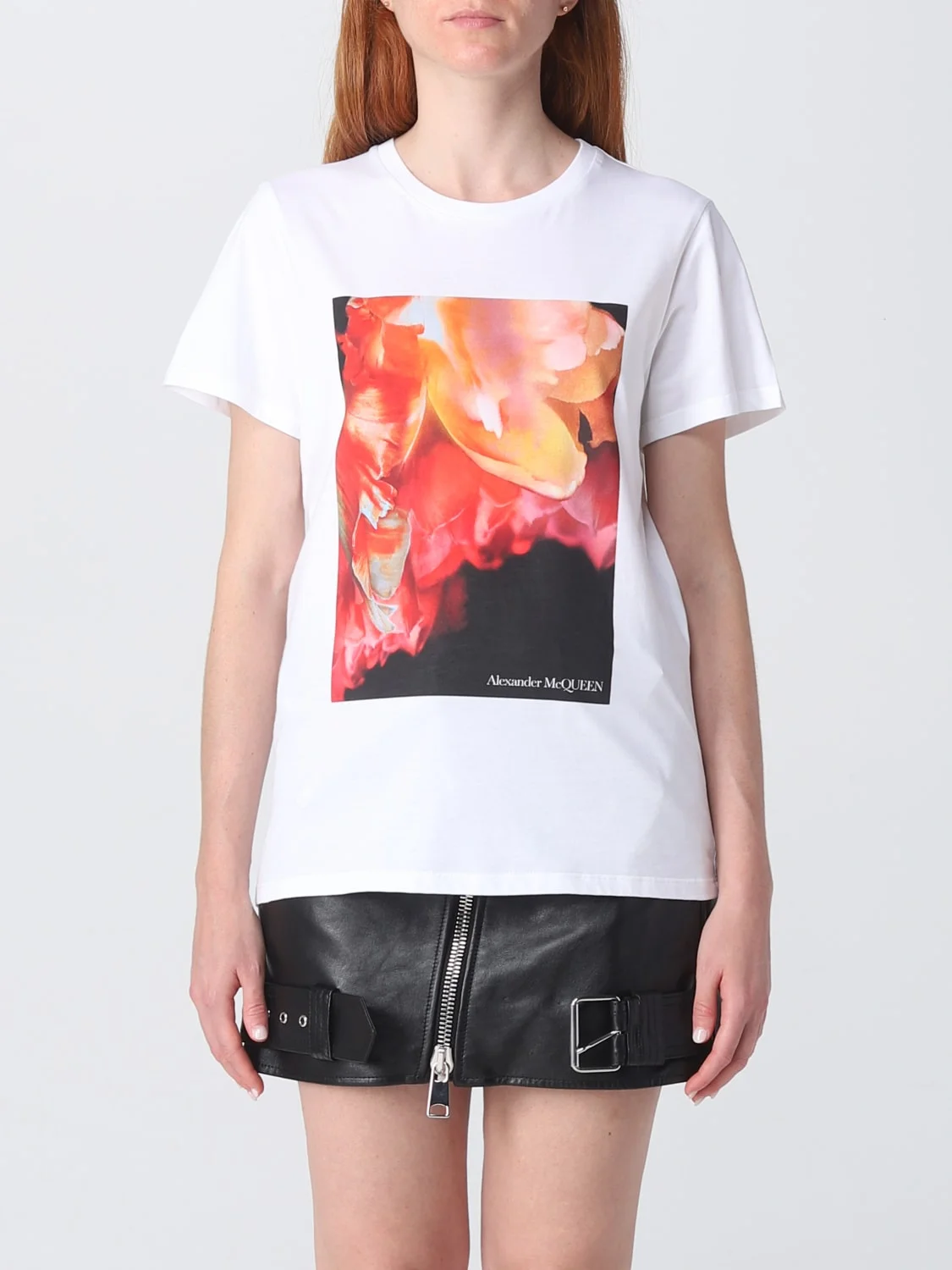DESCRIPTION - Style: Casual - Logo: Contrasting - Model: Crewneck - Neckline: Crewneck - Shoulders: Regular - Sleeves: Short - Bottom: With straight hemline - Materials: Cotton - Pattern: Graphic DETAILS AND CARE Composition 100% CO SIZE AND FIT Sizes not available Size and fit Regular fit Designer code: 758060QZAJ1 0900 Giglio Code: E49109 Designer: McQueen Collection: McQueen Woman Category: Clothing McQueen