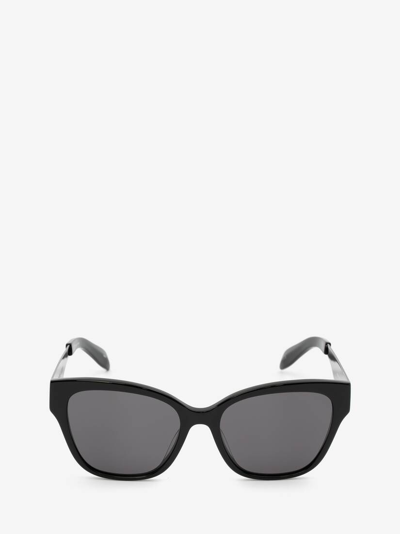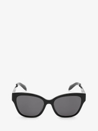 Shiny black cat-eye acetate sunglasses featuring smoke lenses. Finished with shiny silver metal temples and shiny black acetate tips and the McQueen Graffiti signature in black on both sides. All Alexander McQueen Eyewear is 100% certified UV protective (UVA and UVB rays). Material:100% Metal Product Code:689643J07701003