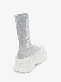 Silver boot featuring a ribbed lurex knit sock upper finished with a white McQueen Graffiti signature and an oversized rubber tread sole. The boot is detailed with a textured rubber wrap and tonal Alexander McQueen signature. Round toe shape boot silhouette details rubber toe cap. Material:Viscose and silk Product Code:708096W4UA18291