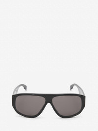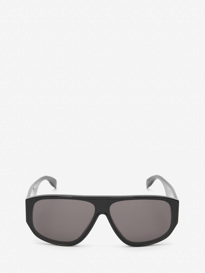 Shiny black acetate sunglasses featuring a mask construction with smoke lenses. Finished with a contrasting white McQueen Graffiti printed signature on one temple only. All Alexander McQueen Eyewear is 100% certified UV protective (UVA and UVB rays). Material:100% Acetate Product Code:712384J07401056