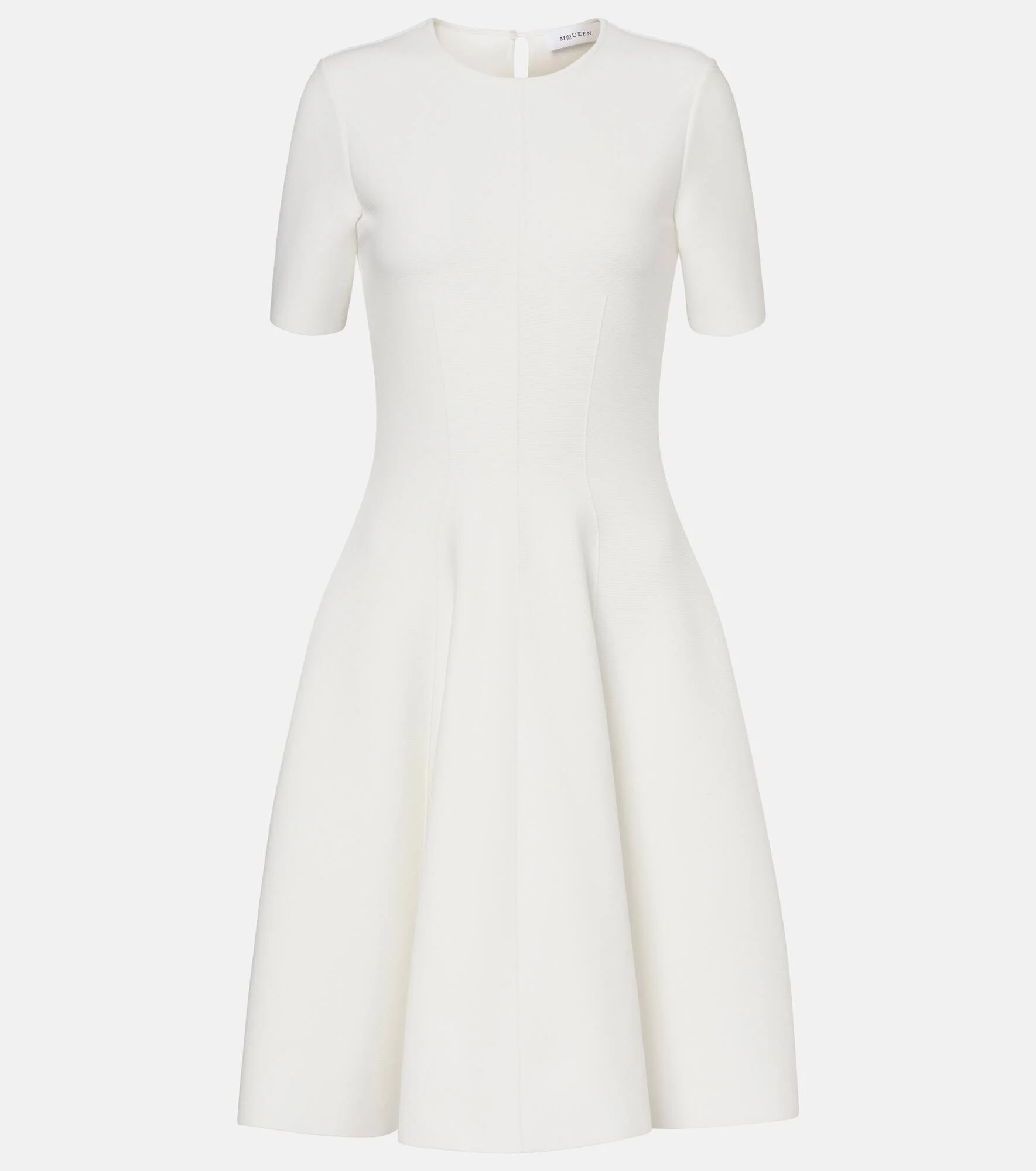 Crafted from heavyweight jersey, this minidress from McQueen features a fitted bodice with a softly pleated skirt. Made in Italy, the charming design is complete with a crew neckline and short sleeves for a polished finish. Product Details - Material: 59% viscose, 41% polyester - Care instructions: dry clean - Made in Italy - Designer color name: Ivory - Item color: white - Trim: 50% viscose, 33% polyester, 16% polyamide, 1% elastane - Contains non-textile parts of animal origin - Collar: crewneck - Item number: P01064332 Size & Fit - True to size - Fitted bodice, loose skirt - Thick material - Stretchy fabric - The model seen in the picture is 178cm-5'10" and wearing a size XS