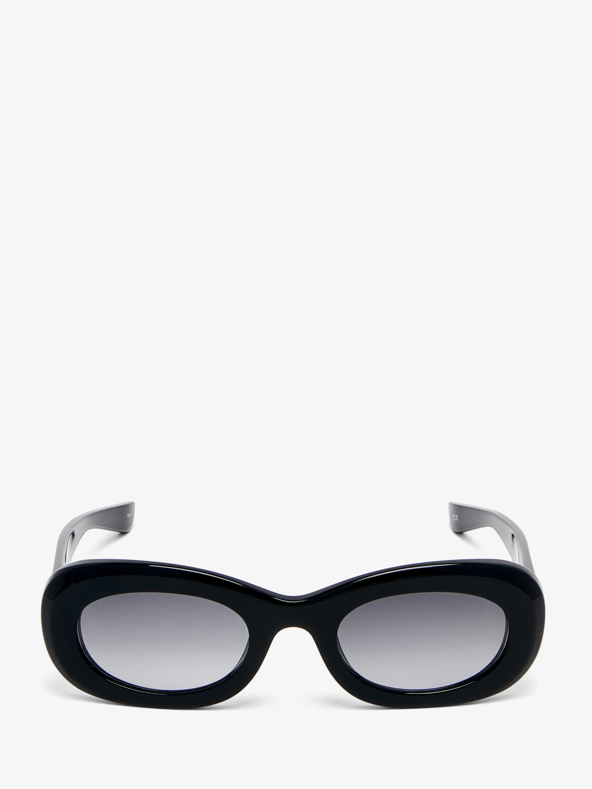 Black acetate sunglasses fitted with gradient gray lenses. The sunglasses have an oval shape and are detailed with a silver metal McQueen logo on the temples. All McQueen eyewear is 100% certified UV protective (UVA and UVB rays). Product details - The Eastman Acetate Renew used in this style includes 27% recycled material achieved via mass balance approach. - The style can be fitted with prescription lenses. - Product code: 841891J07491053 - Made in ITALY - Material: Recycle Acetate & Bio Nylon Lens