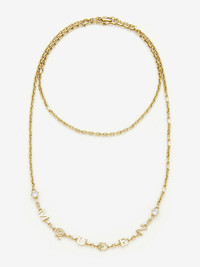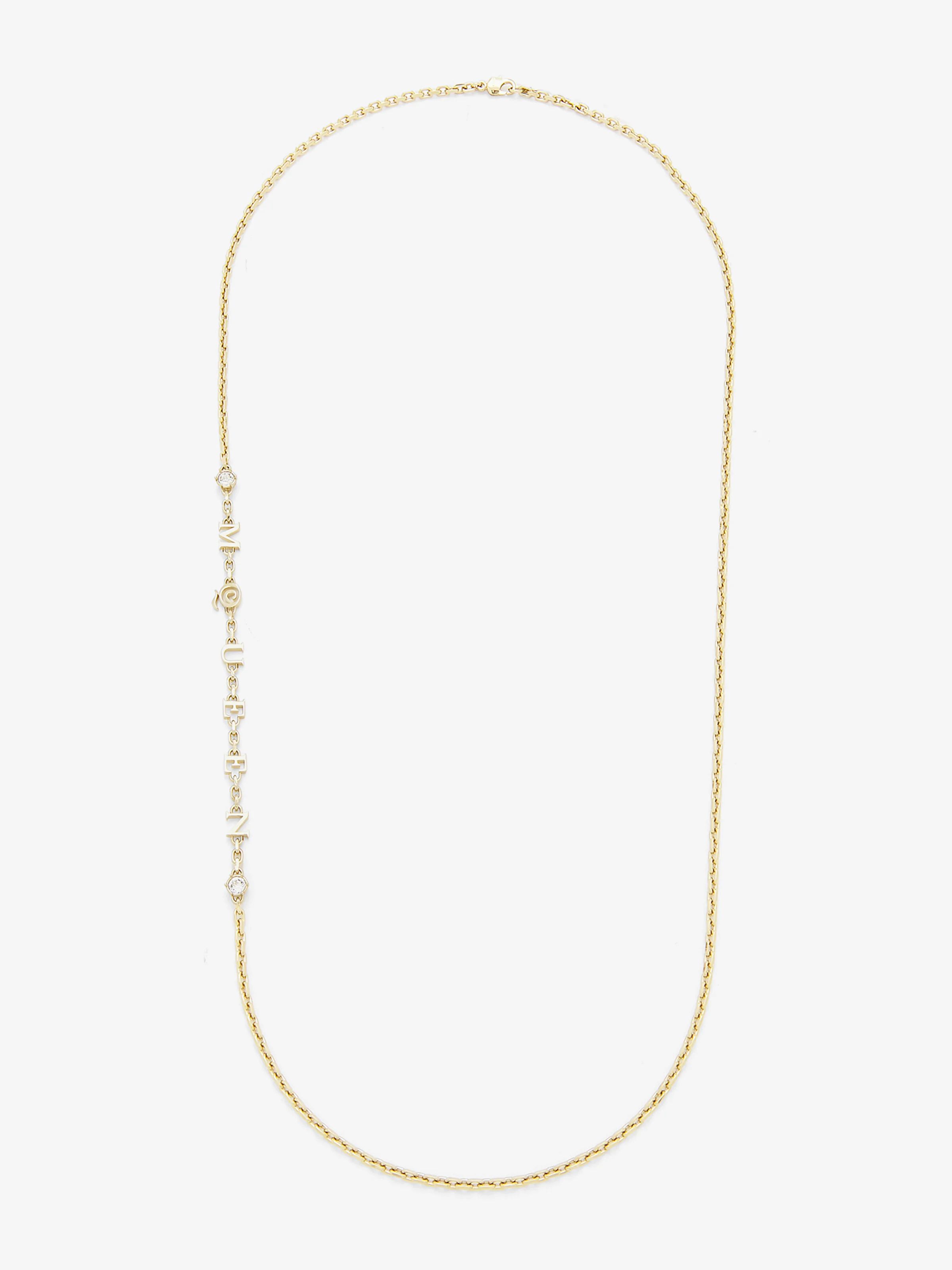 Pale gold-finished chain necklace featuring McQueen logo and crystal detailing. Lobster clasp closure with crystal charm. Eco-brass hardware. Product details - Eco-brass hardware - Pale gold finish - Lobster clasp closure - Total length when closed at first link: 82.5 cm / 32.4 inches - Product code: 836401J161C1035 - Made in Italy - Material: Brass